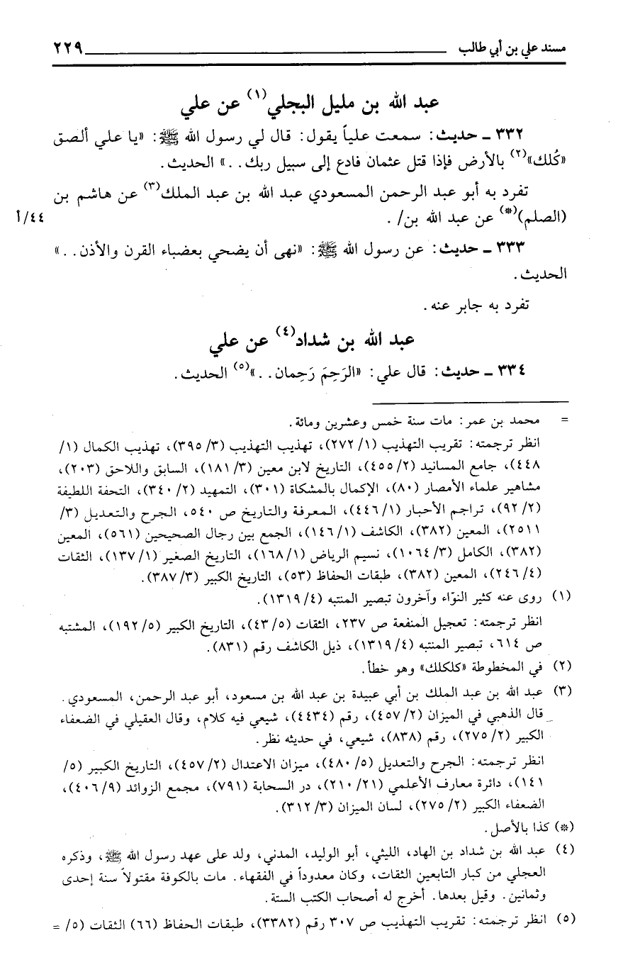 332 - حَدِيث: سَمِعت عليا يَقُول: قَالَ لي رَسُول الله: ((يَا عَليّ الصق ((كلُك)) بِالْأَرْضِ فَإِذا قتل عُثْمَان فَادع إِلَى سَبِيل رَبك. .)) الحَدِيث.