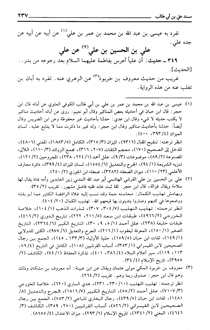 تفرد بِهِ عِيسَى بن عبد الله بن مُحَمَّد بن عمر بن عَليّ عَن أَبِيه عَن أَبِيه عَن جده عَليّ.