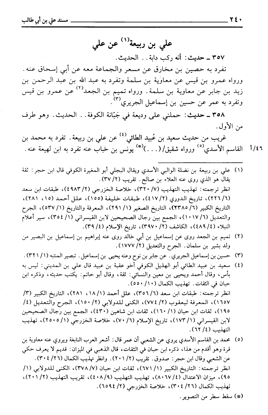 تفرد بِهِ حُصَيْن بن مُخَارق عَن مسعر وَالْجَمَاعَة مَعَه عَن أبي إِسْحَاق عَنهُ. وَرَوَاهُ عَمْرو بن قيس عَن مُعَاوِيَة بن سَلمَة وَتفرد بِهِ عبد الله بن عبد الرَّحْمَن بن زيد بن جَابر عَن مُعَاوِيَة بن سَلمَة. وَرَوَاهُ تَمِيم بن الْجَعْد عَن عَمْرو بن قيس وَتفرد بِهِ عمر عَن حُسَيْن بن إِسْمَاعِيل الْجريرِي.