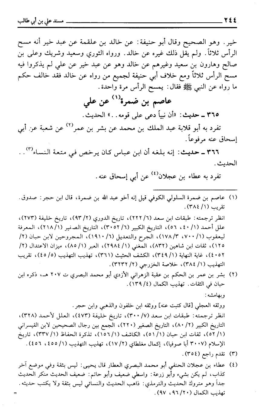 خير. وَهُوَ الصَّحِيح وَقَالَ أَبُو حنيفَة: عَن خَالِد بن عَلْقَمَة عَن عبد خير أَنه مسح الرَّأْس ثَلَاثًا. وَلم يقل ذَلِك غَيره عَن خَالِد. وَرَوَاهُ الثَّوْريّ وَسَعِيد وَشريك وعَلى بن صَالح وَهَارُون بن سعيد وَغَيرهم عَن خَالِد وَهُوَ عَن عبد خير عَن عَليّ لم يذكرُوا فِيهِ مسح الرَّأْس ثَلَاثًا وَمَعَ خلاف أبي حنيفَة لجَمِيع من رَوَاهُ عَن خَالِد فقد خَالف حكم مَا رَوَاهُ عَن النَّبِي فَقَالَ: يمسح الرَّأْس مرّة وَاحِدَة.
