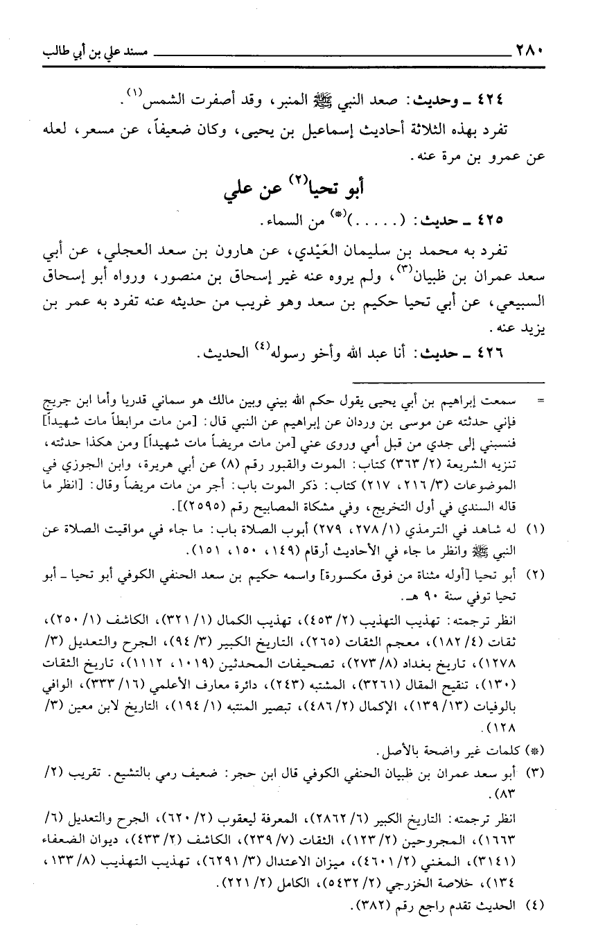 تفرد بِهِ مُحَمَّد بن سُلَيْمَان العَيْدي، عَن هَارُون ببن سعد الْعجلِيّ، عَن أبي سعد عمرَان بن ظبْيَان، وَلم يروه عَنهُ غير إِسْحَاق بن مَنْصُور، وَرَوَاهُ أَبُو إِسْحَاق السبيعِي، عَن أبي تحيا حَكِيم بن سعد وَهُوَ غَرِيب من حَدِيثه عَنهُ تفرد بِهِ عمر بن يزِيد عَنهُ.