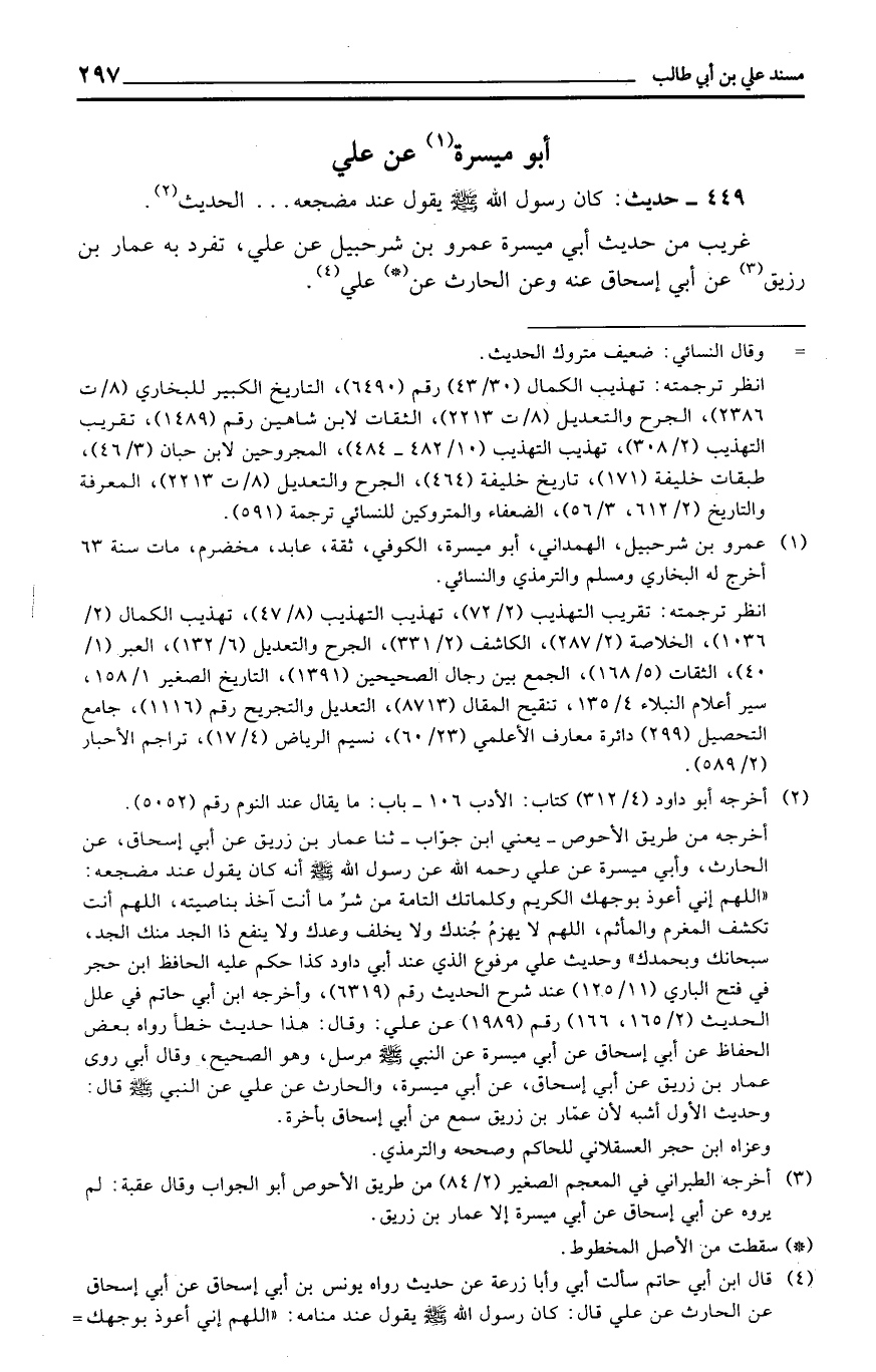 غَرِيب من حَدِيث أبي ميسرَة عَمْرو بن شُرَحْبِيل عَن عَليّ، تفرد بِهِ عمار بن رُزَيْق عَن أبي إِسْحَاق عَنهُ وَعَن الْحَارِث عَن عَليّ.