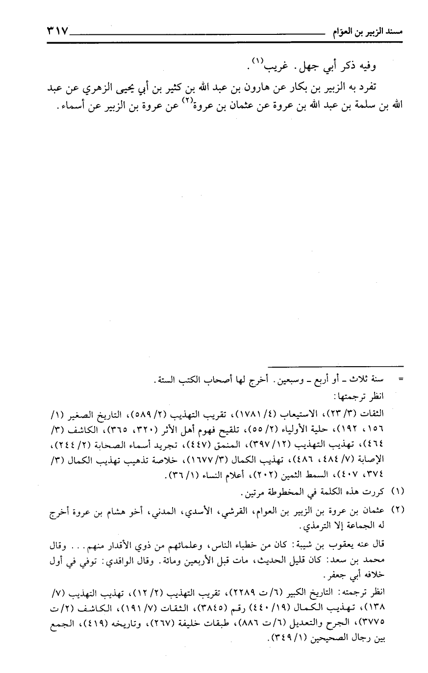 تفرد بِهِ الزبير بن بكار عَن هَارُون بن عبد الله بن كثير بن أبي يحيى الزُّهْرِيّ عَن عبد الله بن سَلمَة بن عبد الله بن عُرْوَة عَن عُثْمَان بن عُرْوَة عَن عُرْوَة بن الزبير عَن أَسمَاء
