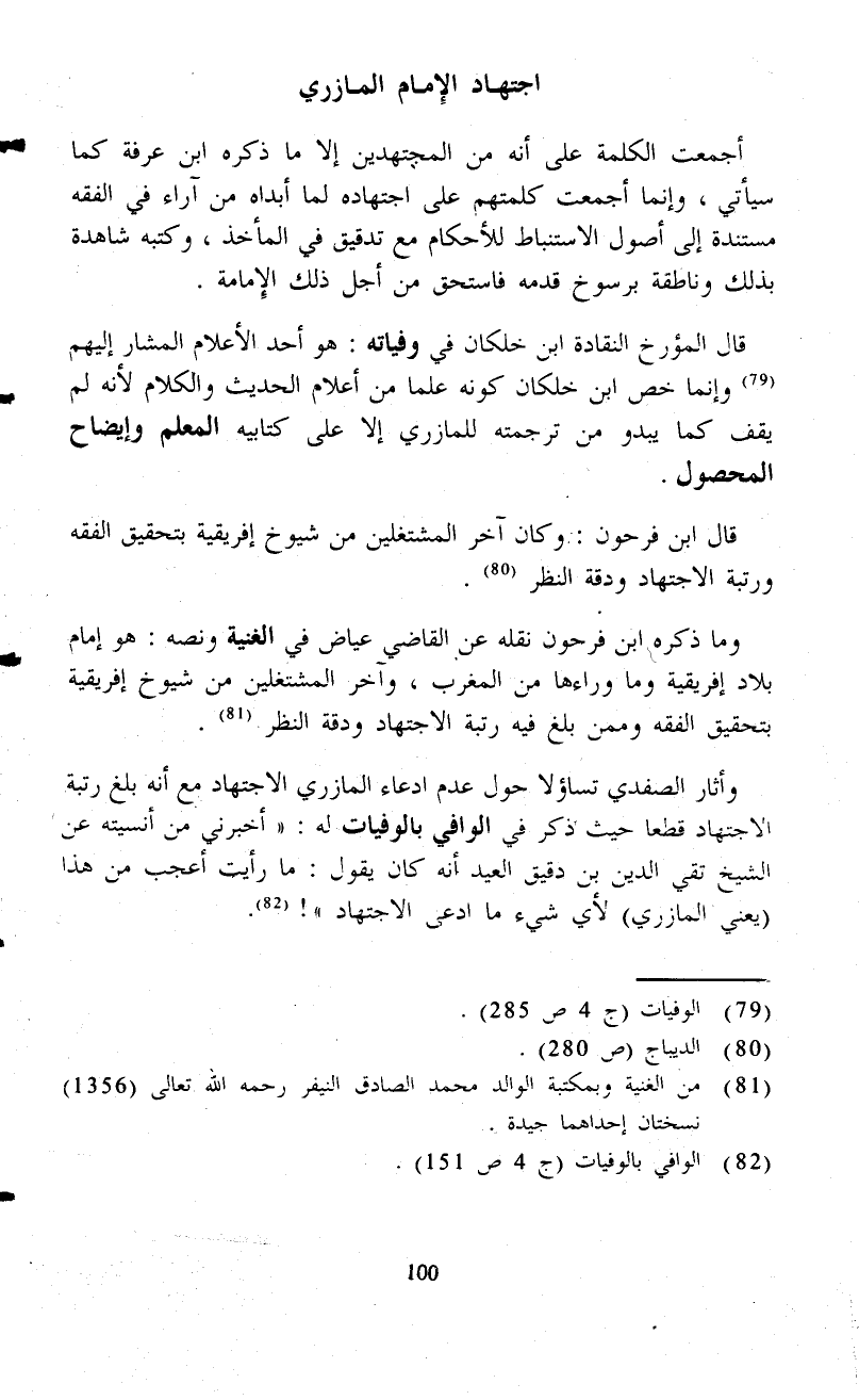 وأثار الصفدي تساؤلا حول عدم ادعاء المازري الاجتهاد مع أنه بلغ رتبة الاجتهاد قطعاً حيث ذكر في الوافي بالوفيات له: "أخبرنى من أنسيته عن الشيخ تقي الدين بن دقيق العيد أنه كان يقول: ما رأيت أعجب من هذا (يعني المازري) لأي شيء ما ادعى الاجتهاد" (¬82).