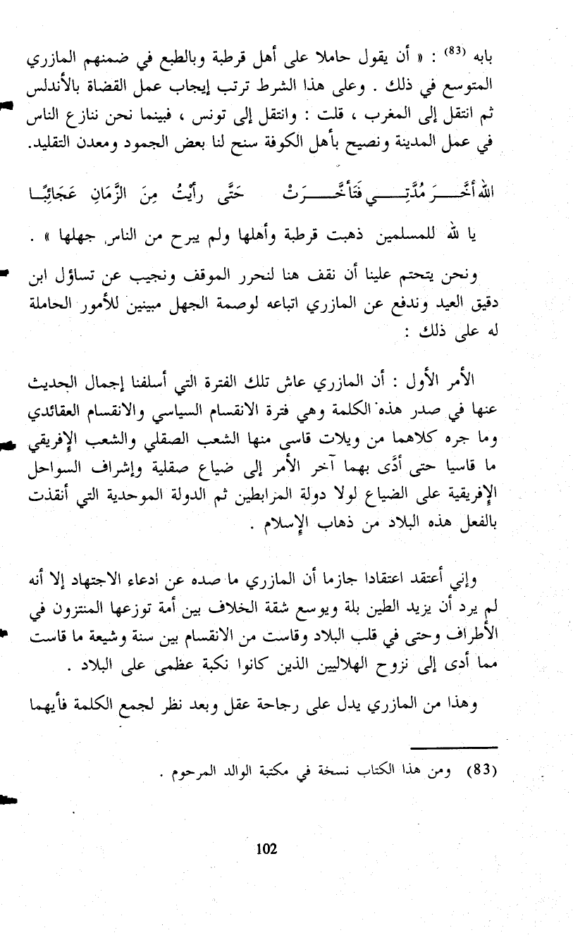وإني أعتقد اعتقاداً جازما أن المازري ما صده عن ادعاء الاجتهاد إلا أنه لم يرد أن يزيد الطين بلة ويوسع شقة الخلاف بين أمة توزعها المنتزون في الأطراف وحتى في قلب البلاد وقاست من الانقسام بين سنة وشيعة ما قاست مما أدى إلى نزوح الهلاليين الذين كانوا نكبة عظمى على البلاد.