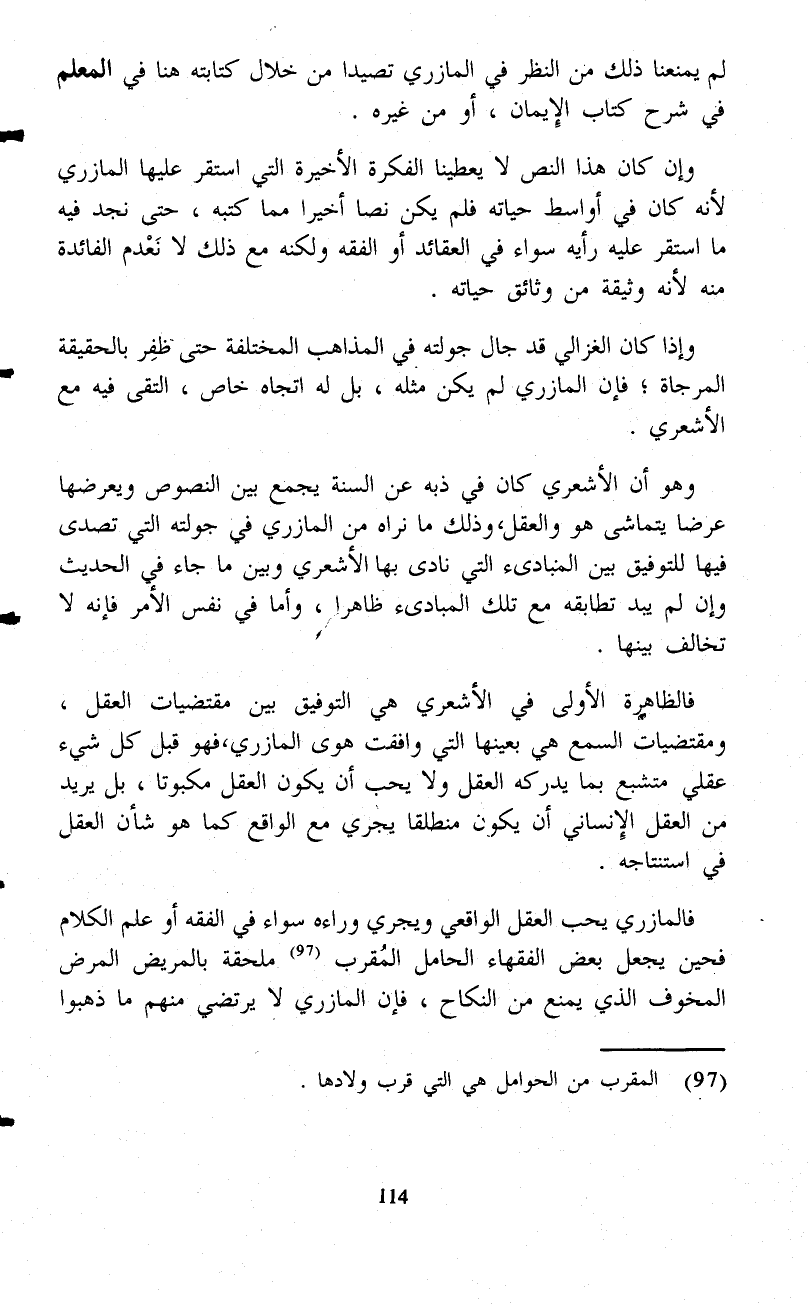 فالمازري يحب العقل الواقعي ويجري وراءه سواء في الفقه أو علم الكلام فحين يجعل بعض الفقهاء الحامل المُقرب (¬97) ملحقة بالمريض المرض المخوف الذي يمنع من النكاح، فإن المازري لا يرتضي منهم ما ذهبوا