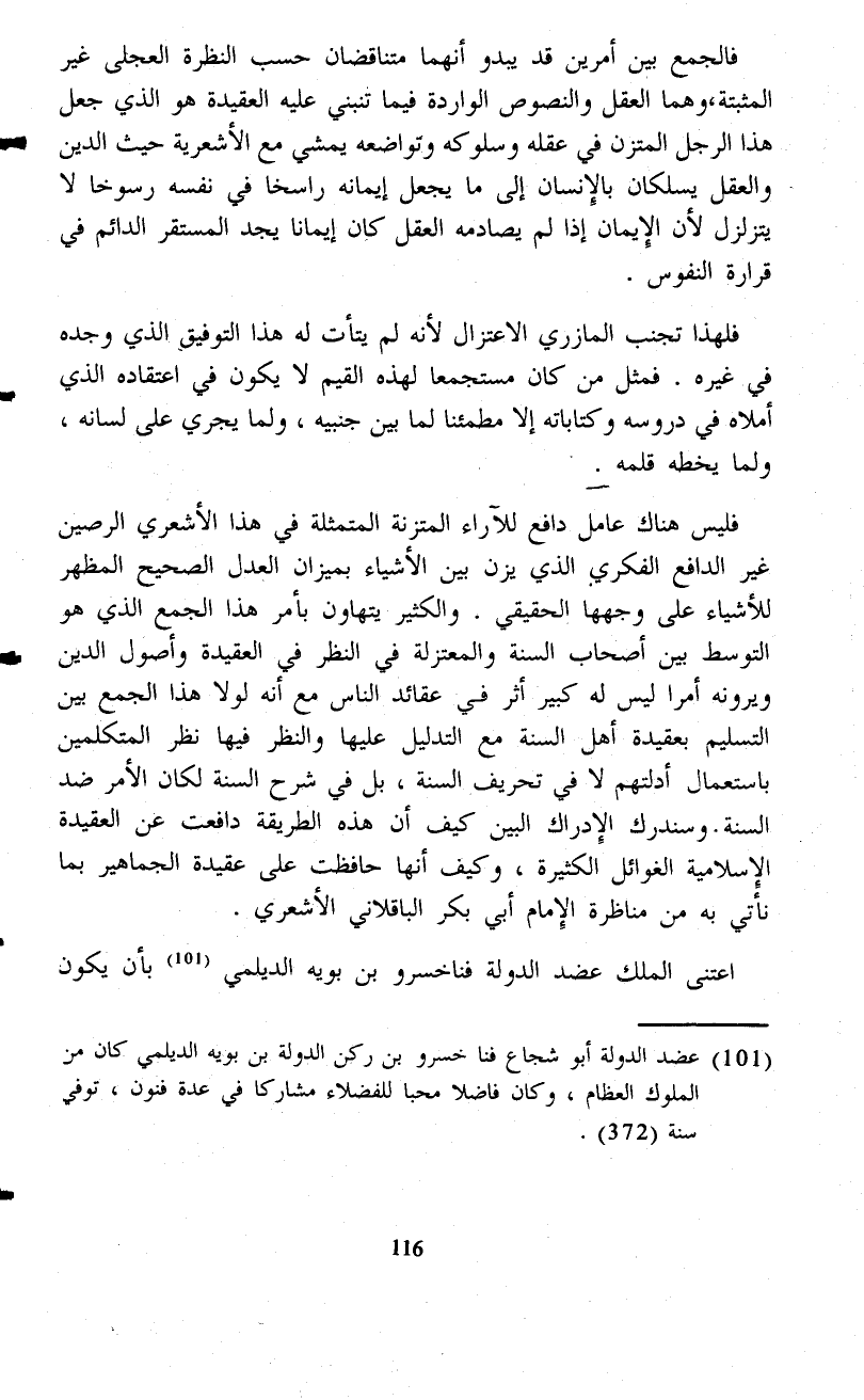 فالجمع بين أمرين قد يبدو أنهما متناقضان حسب النظرة العجلى غير المثبتة، وهما العقل والنصوص الواردة فيما تنبني عليه العقيدة هو الذي جعل هذا الرجل المتزن في عقله وسلوكه وتواضعه يمشي مع الأشعرية حيث الدين والعقل يسلكان بالإِنسان إلى ما يجعل إيمانه راسخاً في نفسه رسوخاً لا يتزلزل لأن الإِيمان إذا لم يصادمه العقل كان إِيمانا يجد المستقر الدائم في قرارة النفوس.