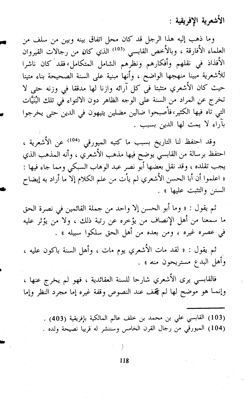 وما ذهب إليه هذا الرجل قد كان محل اتفاق بينه وبين من سلف من العلماء الأفارقة، وبالأخص القابسي (¬103) الذي كان من رجالات القيروان الأفذاذ في نقلهم وأفكارهم ونظرهم الشامل المتكامل، فقد كان ناشراً للأشعرية مبينا منهجها الواضح، وأنها مبنية على السنة الصحيحة بناء متيناً حيث كان الأشعري متثبتاً في كل آرائه وازنا لها مدققا في وزنه حتى لا تخرج عن المراد من السنة على الوجه الظاهر دون الالتواء في تلك البُنَيَّات التي تاه فيها الكثير، فأصبحوا ضالين مضلين يتيهون في الدين حتى يخرجوا بآراء لا يمت لها الدين بسبب.
