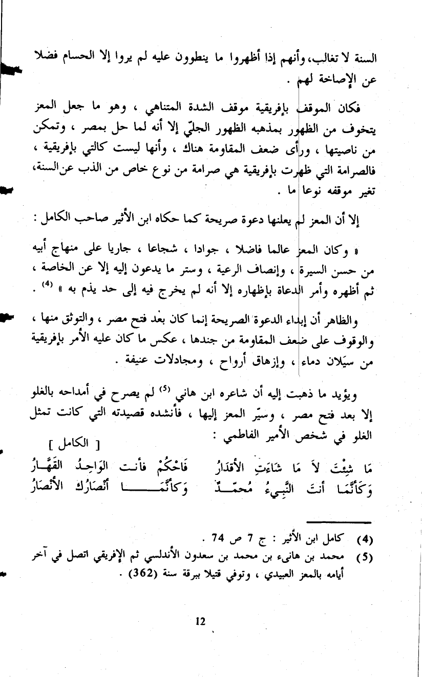 ويؤيد ما ذهبت إليه أن شاعره ابن هاني (¬5) لم يصرح في أمداحه بالغلو إلا بعد فتح مصر، وسيّر المعز إليها، فأنشده قصيدته التي كانت تمثل الغلو في شخص الأمير الفاطمي: [الكامل]
