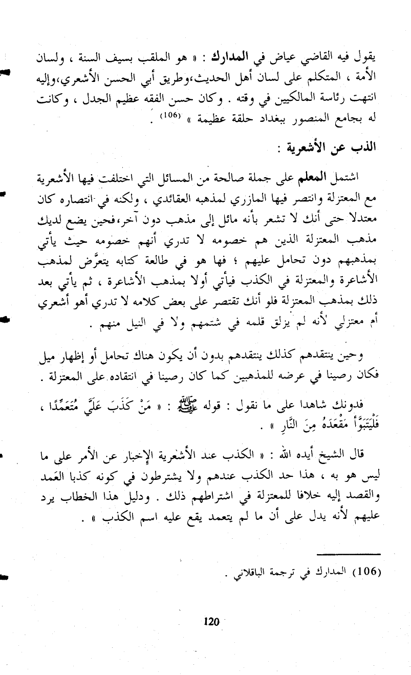 وحين ينتقدهم كذلك ينتقدهم بدون أن يكون هناك تحامل أو إظهار ميل فكان رصيناً في عرضه للمذهبين كما كان رصيناً في انتقاده على المعتزلة.