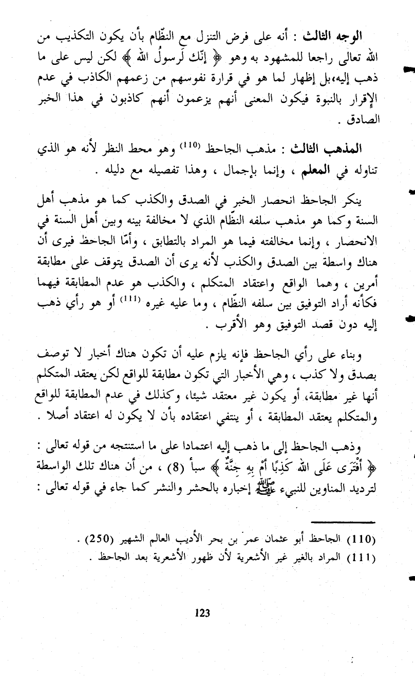 ينكر الجاحظ انحصار الخبر في الصدق والكذب كما هو مذهب أهل السنة وكما هو مذهب سلفه النظّام الذي لا مخالفة بينه وبين أهل السنة في الانحصار، وإنما مخالفته فيما هو المراد بالتطابق، وأمّا الجاحظ فيرى أن هناك واسطة بين الصدق والكذب لأنه يرى أن الصدق يتوقف على مطابقة أمرين، وهما الواقع واعتقاد المتكلم، والكذب هو عدم المطابقة فيهما فكأنه أراد التوفيق بين سلفه النظّام، وما عليه غيره (¬111) أو هو رأي ذهب إليه دون قصد التوفيق وهو الأقرب.