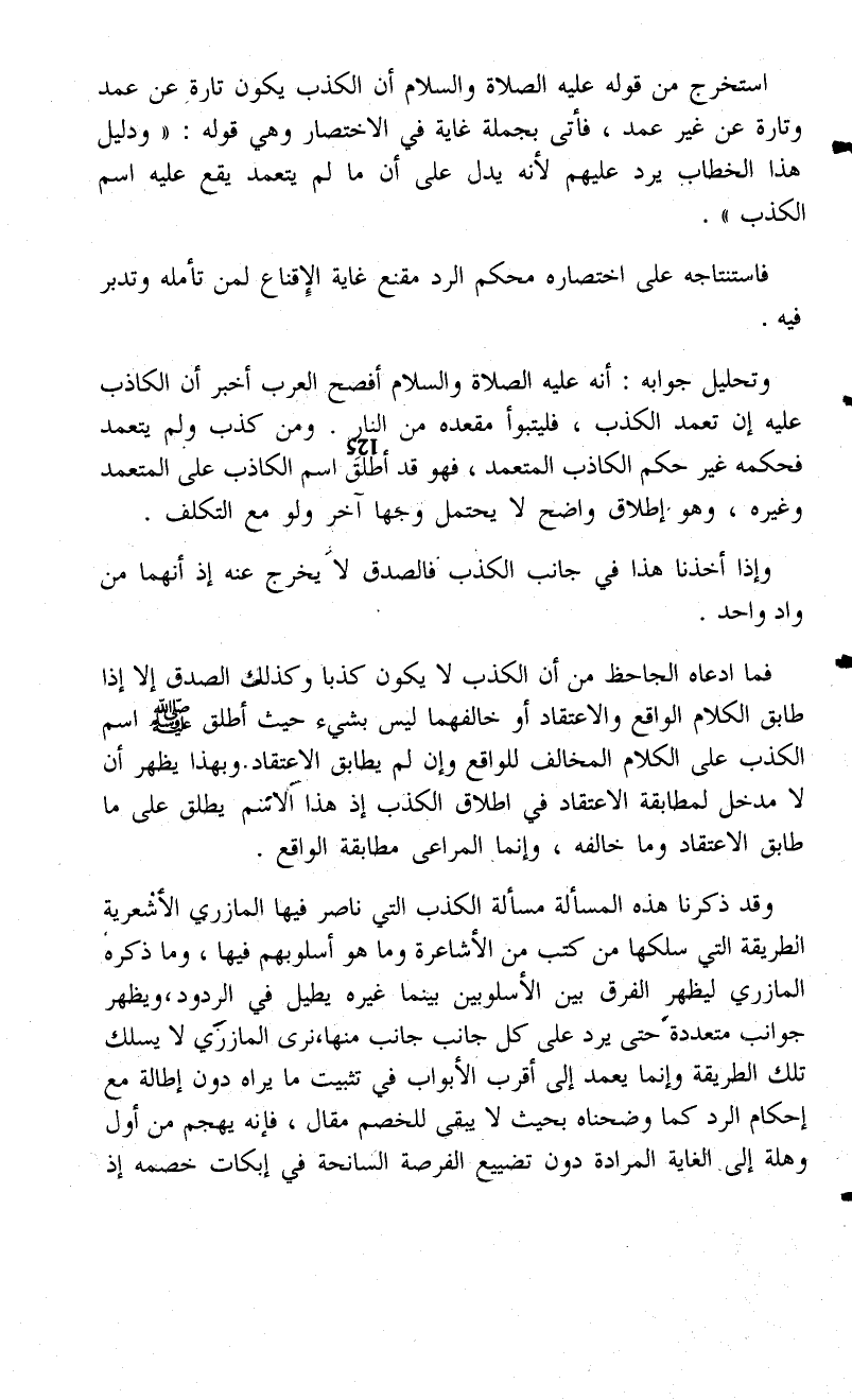 فما ادعاه الجاحظ من أن الكذب لا يكون كذباً وكذلك الصدق إلا إذا طابق الكلام الواقع والاعتقاد أو خالفهما ليس بشيء حيث أطلق - صلى الله عليه وسلم - اسم الكذب على الكلام المخالف للواقع وإن لم يطابق الاعتقاد. وبهذا يظهر أن لا مدخل لمطابقة الاعتقاد في إطلاق الكذب إذ هذا الاسم يطلق على ما طابق الاعتقاد وما خالفه، وإنما المراعى مطابقة الواقع.