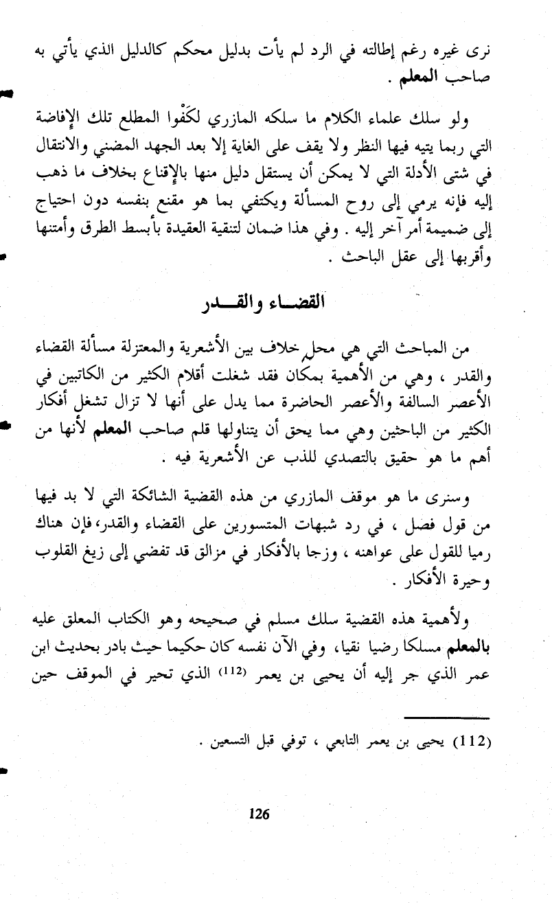 وسنرى ما هو موقف المازري من هذه القضية الشائكة التي لا بد فيها من قول فصل، في رد شبهات المتسورين على القضاء والقدر، فإن هناك رمياً للقول على عواهنه، وزجاً بالأفكار في مزالق قد تفضي إلى زيغ القلوب وحيرة الأفكار.