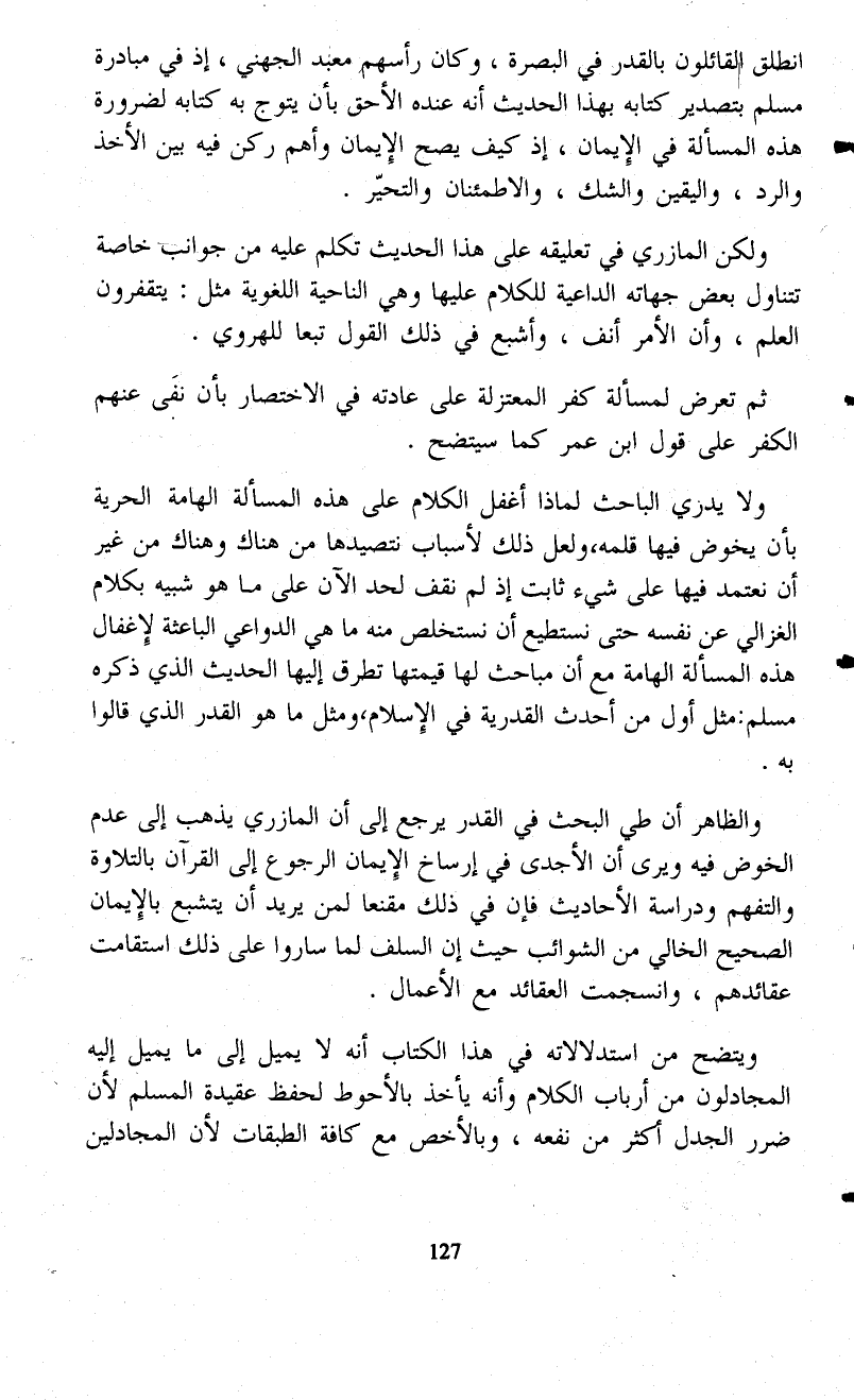 ولا يدرى الباحث لماذا أغفل الكلام على هذه المسألة الهامة الحرية بأن يخوض فيها قلمه، ولعل ذلك لأسباب نتصيدها من هناك وهناك من غير أن نعتمد فيها على شيء ثابت إذ لم نقف لحد الآن على ما هو شبيه بكلام الغزالي عن نفسه حتى نستطيع أن نستخلص منه ما هي الدواعي الباعثة لإِغفال هذه المسألة الهامة مع أن مباحث لها قيمتها تطرق إليها الحديث الذي ذكره مسلم: مثل أول من أحدث القدرية في الإِسلام، ومثل ما هو القدر الذي قالوا به.