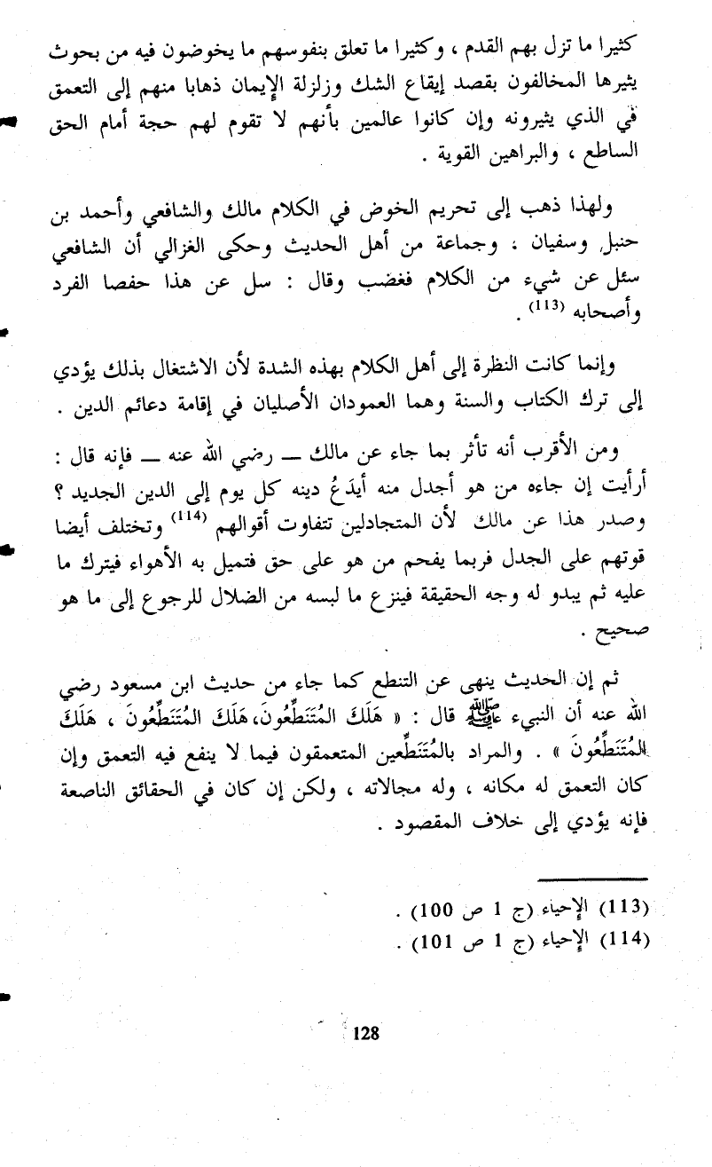 ولهذا ذهب إلى تحريم الخوض في الكلام مالك والشافعي وأحمد بن حنبل وسفيان، وجماعة من أهل الحديث وحكى الغزالي أن الشافعي سئل عن شيء من الكلام فغضب وقال: سل عن هذا حفصا الفرد وأصحابه (¬113).