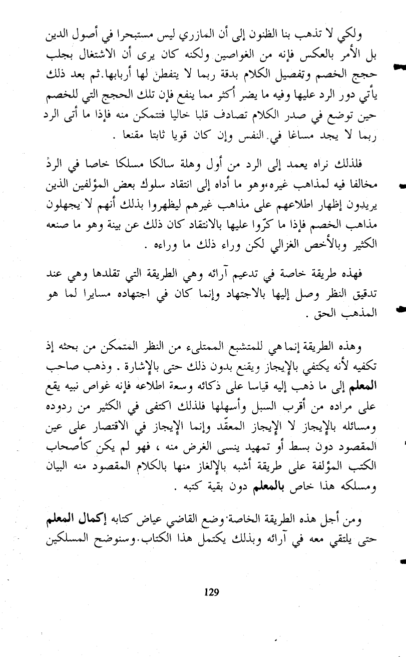 وهذه الطريقة إنما هي للمتشبع الممتلىء من النظر المتمكن من بحثه إذ تكفيه لأنه يكتفي بالإِيجاز ويقنع بدون ذلك حتى بالإِشارة. وذهب صاحب المعلم إلى ما ذهب إليه قياساً على ذكائه وسعة اطلاعه فإنه غواص نبيه يقع على مراده من أقرب السبل وأسهلها فلذلك اكتفى في الكثير من ردوده ومسائله بالإِيجاز لا الإِيجاز المعقّد وإنما الإِيجاز في الاقتصار على عين المقصود دون بسط أو تمهيد ينسى الغرض منه، فهو لم يكن كأصحاب الكتب المؤلفة على طريقة أشبه بالإِلغاز منها بالكلام المقصود منه البيان ومسلكه هذا خاص بالمعلم دون بقية كتبه.