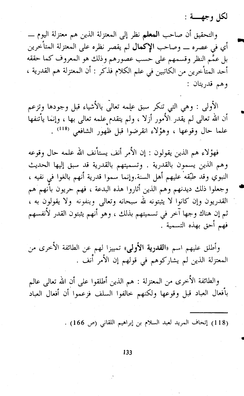 والتحقيق أن صاحب المعلم نظر إلى المعتزلة الذين هم معتزلة اليوم -أي في عصره- وصاحب الإِكمال لم يقصر نظره على المعتزلة المتأخرين بل عمَّم النظر وقسمهم على حسب عصورهم وذلك هو المعروف كما حققه أحد المتأخرين من الكاتبين في علم الكلام فذكر: أن المعتزلة هم القدرية، وهم قدريتان: