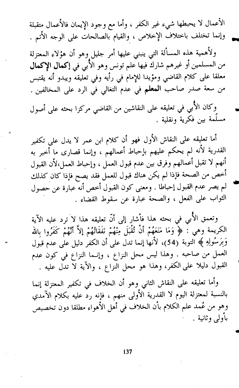 وتعمق الأُبي في بحثه هذا فأشار إلى أنّ تعليقه هذا لا ترد عليه الآية الكريمة وهي: {وَمَا مَنَعَهُمْ أَنْ تُقْبَلَ مِنْهُمْ نَفَقَاتُهُمْ إِلَّا أَنَّهُمْ كَفَرُوا بِاللَّهِ وَبِرَسُولِهِ} التوبة (54)، لأنها إنما تدل على أن الكفر دليل على عدم قبول العمل من صاحبه. وهذا ليس محل النزاع، وإنما النزاع في كون عدم القبول دليلاً على الكفر، وهذا هو محل النزاع، والآية لا تدل عليه.