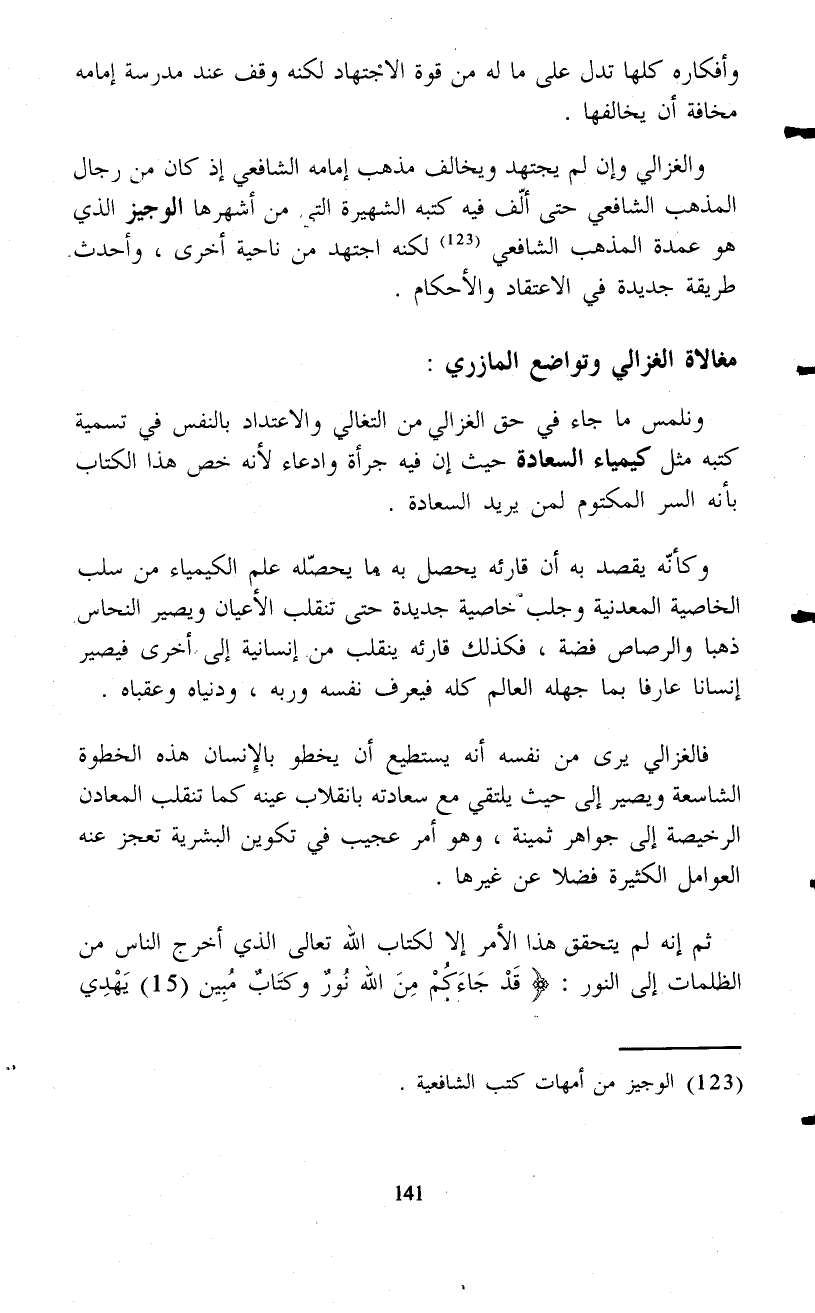 والغزالي وإن لم يجتهد ويخالف مذهب إمامه الشافعي إذ كان من رجال المذهب الشافعي حتى ألّف فيه كتبه الشهيرة التي من أشهرها الوجيز الذي هو عمدة المذهب الشافعي (¬123) لكنه اجتهد من ناحية أخرى، وأحدث طريقة جديدة في الاعتقاد والأحكام.