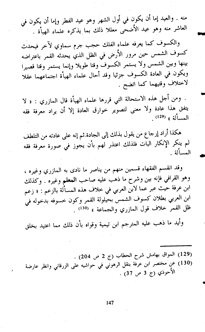 ومن أجل هذه الاستحالة التي قررها علماء الهيأة قال المازري: "لا يتفق هذا عادة ولا معنى لتصوير خوارق العادة إلا أن يراد معرفة فقه المسألة" (¬129).