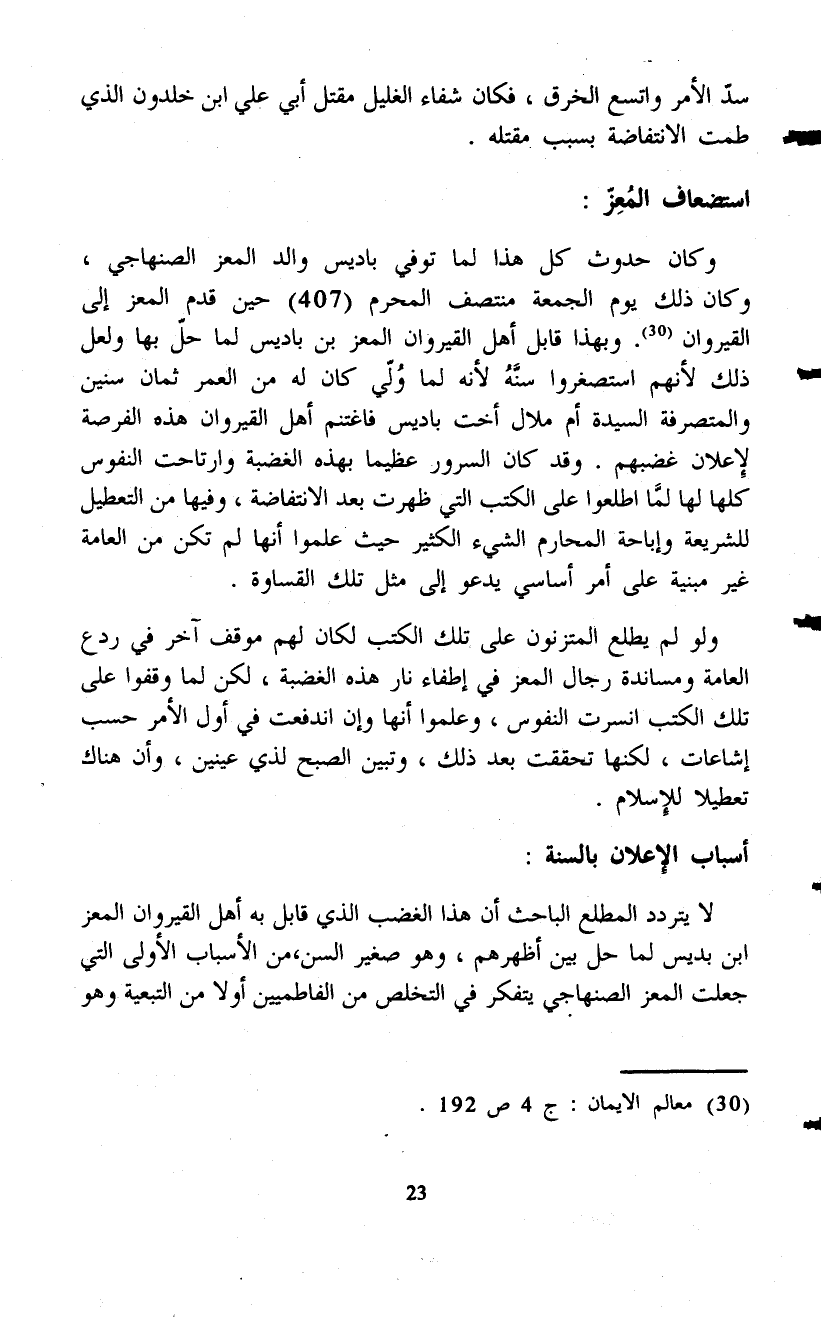 وكان حدوث كل هذا لما توفي باديس والد المعز الصنهاجي، وكان ذلك يوم الجمعة منتصف المحرم (407) حين قدم المعز إلى القيروان (¬30). وبهذا قابل أهل القيروان المعز بن باديس لما حلّ بها ولعل ذلك لأنهم استصغروا سنَّهُ لأنه لما وُلّي كان له من العمر ثمان سنين والمتصرفة السيدة أم ملال أخت باديس فاغتنم أهل القيروان هذه الفرصة لإِعلان غضبهم. وقد كان السرور عظيما بهذه الغضبة وارتاحت النفوس كلها لها لما اطلعوا على الكتب التي ظهرت بعد الانتفاضة، وفيها من التعطيل للشريعة وإباحة المحارم الشيء الكثير حيث علموا أنها لم تكن من العامة غير مبنية على أمر أساسي يدعو إلى مثل تلك القساوة.