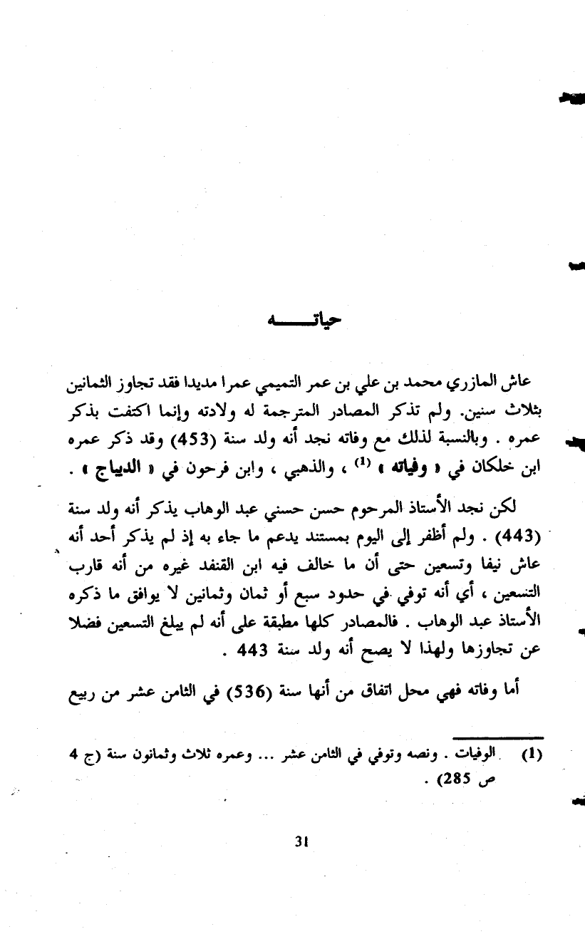 لكن نجد الأستاذ المرحوم حسن حسني عبد الوهاب يذكر أنه ولد سنة (443). ولم أظفر إلى اليوم بمستند يدعم ما جاء به إذ لم يذكر أحد أنه عاش نيفا وتسعين حتى أن ما خالف فيه ابن القنفد غيره من أنه قارب التسعين، أي أنه توفي في حدود سبع أو ثمان وثمانين لا يوافق ما ذكره الأستاذ عبد الوهاب. فالمصادر كلها مطبقة على أنه لم يبلغ التسعين فضلا عن تجاوزها ولهذا لا يصح أنه ولد سنة 443.