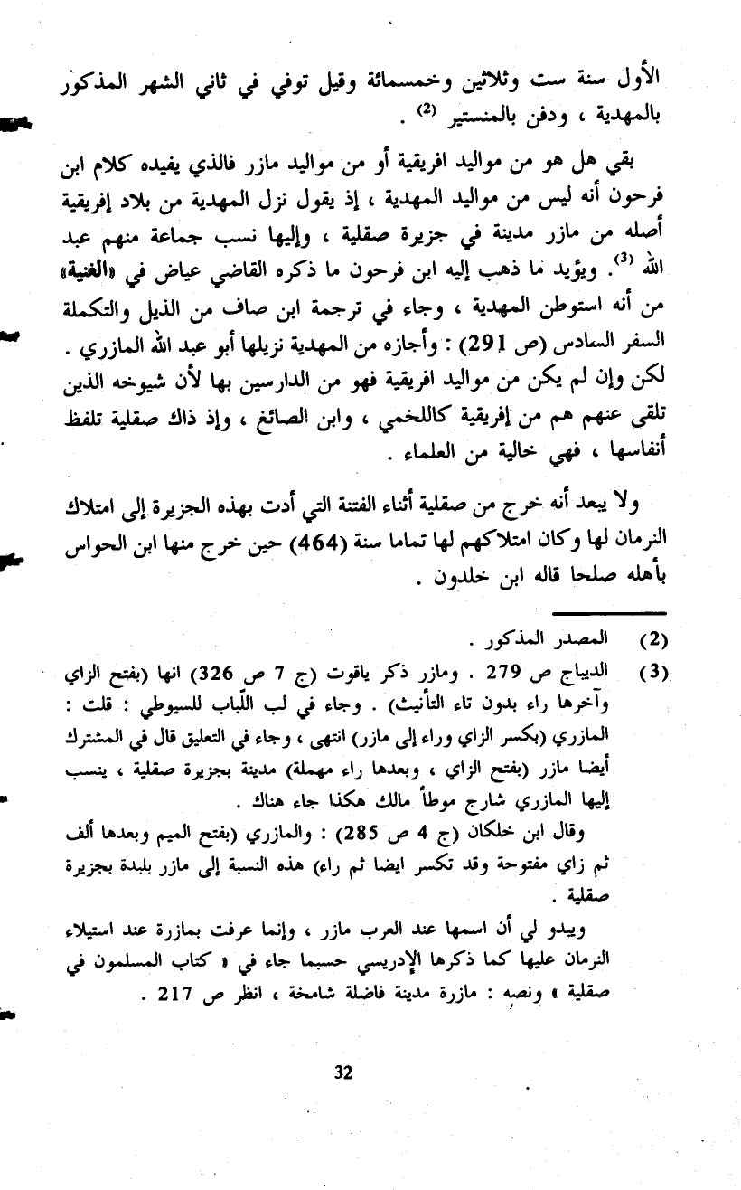 (¬3) الديباج ص 279. ومازر ذكر ياقوت (ج7 ص 326) أنها (بفتح الزاي وآخرها راء بدون تاء التأنيث). وجاء في لب اللّباب للسيوطى: قلت: المازري (بكسر الزاي وراء إلى مازر) انتهى، وجاء في التعليق قال في المشترك أيضاً مازر (بفتح الزاي، وبعدها راء مهملة) مدينة بجزيرة صقلية، ينسب إليها المازري شارح موطأ مالك هكذا جاء هناك.
