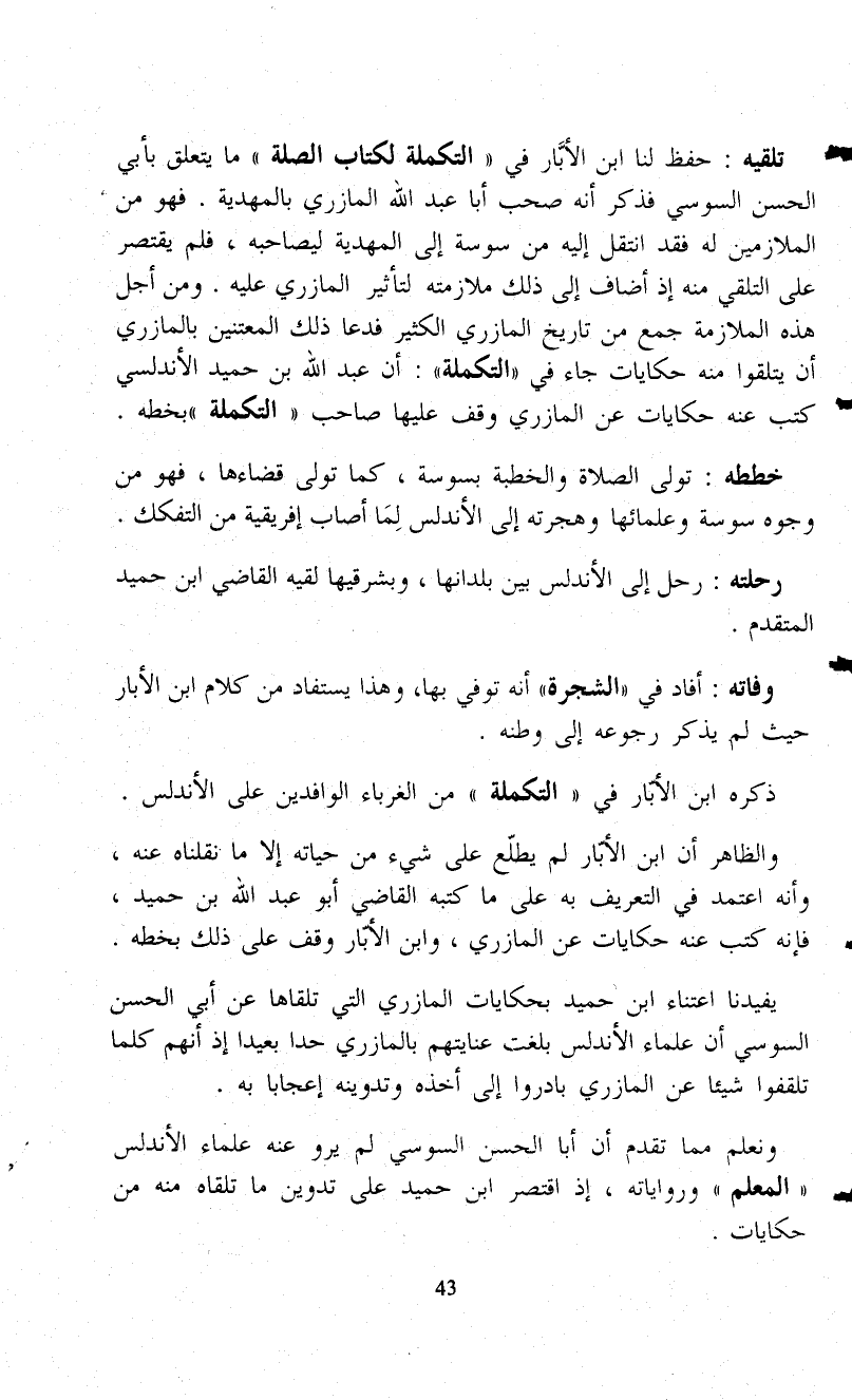 والظاهر أن ابن الأبّار لم يطلّع على شيء من حياته إلا ما نقلناه عنه، وأنه اعتمد في التعريف به على ما كتبه القاضي أبو عبد الله بن حميد، فإنه كتب عنه حكايات عن المازري، وابن الأبّار وقف على ذلك بخطه.