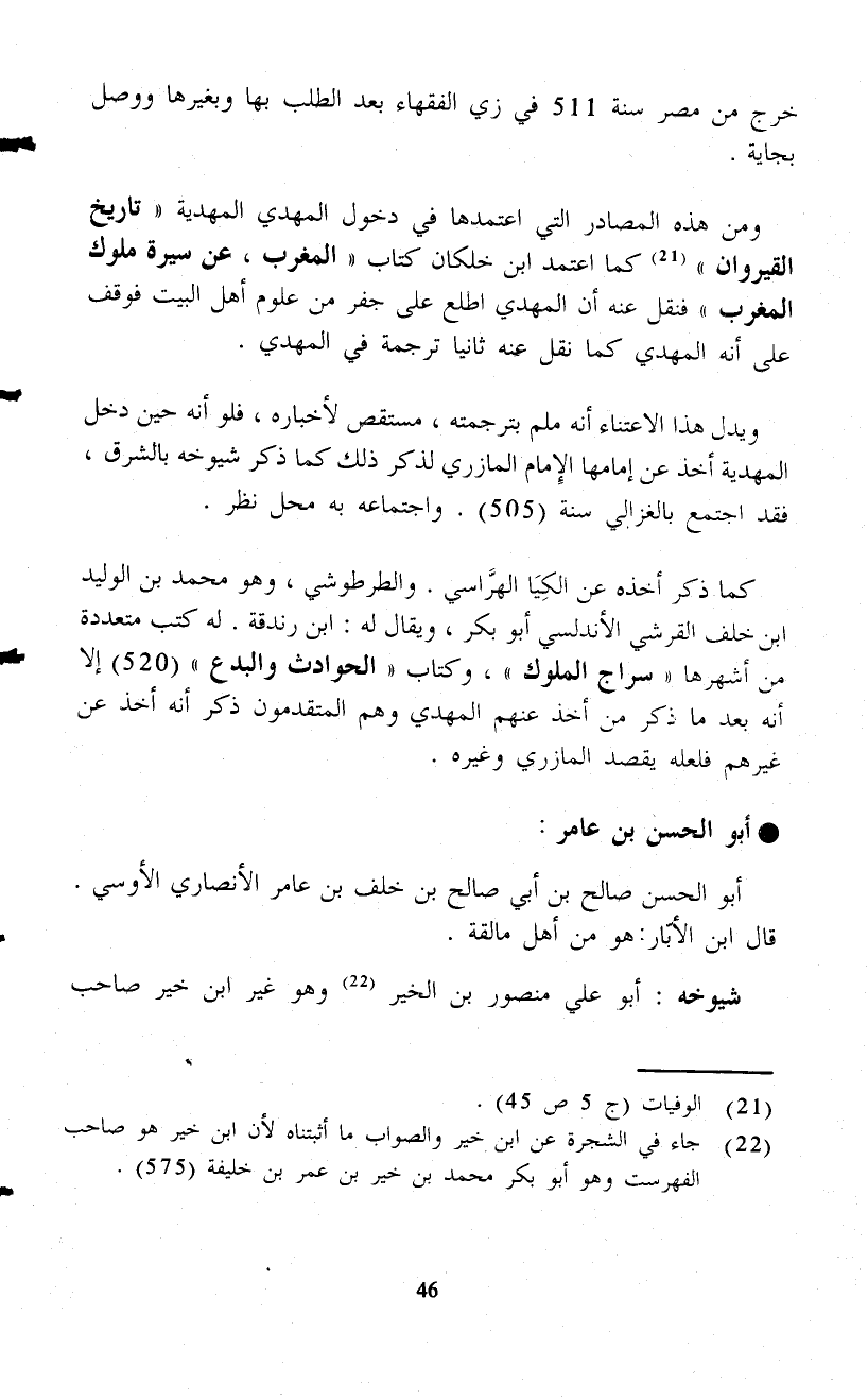 ومن هذه المصادر التي اعتمدها في دخول المهدي المهدية "تاريخ القيروان" (¬21) كما اعتمد ابن خلكان كتاب "المغرب، عن سيرة ملوك المغرب" فنقل عنه أن المهدي اطلع على جفر من علوم أهل البيت فوقف على أنه المهدي كما نقل عنه ثانيا ترجمة في المهدي.