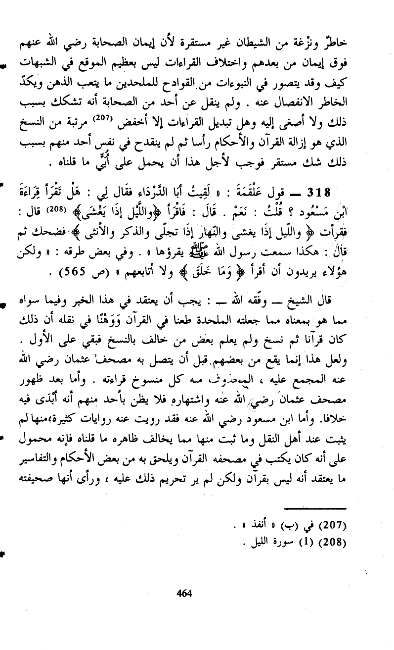 318 - قول عَلْقَمَةَ: "لَقِيتُ أبَا الدَّرْدَاء فقَال لِي: هَلْ تَقْرَأ قِرَاءَةَ ابْن مَسْعُود؟ قُلْتُ: نَعَمْ. قَالَ: فَاقْرَأ {وَاللَّيْلِ إِذَا يَغْشَى} (¬208) قال: فقرأت {وَاللَّيْلِ إِذَا يَغْشَى (1) وَالنَّهَارِ إِذَا تَجَلَّى (2) وَالذَّكَرَ وَالْأُنْثَى} فضحك ثم قال: هكذا سمعت رسول الله - صلى الله عليه وسلم - يقرؤها". وفي بعض طرقه: "ولكن هؤلاء يريدون أن أقرأ {وَمَا خَلَقَ} ولا أتابعهم" (ص 565).