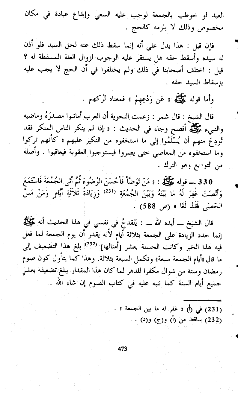 330 - قوله - صلى الله عليه وسلم -: "مَنْ تَوَضَّأ فَأحْسَنَ الوُضُوءَ ثُمَّ أتَى الجُمُعَةَ فَاسْتَمَعَ وَأنْصَتَ غُفِرَ لَهُ مَا بَيْنَهُ وَبَيْنَ الجُمُعَةِ (¬231) وَزِيَادَةُ ثَلاَثَةِ أيَّامٍ وَمَنْ مَسَّ الحَصَى فَقَدْ لَغَا" (ص 588).