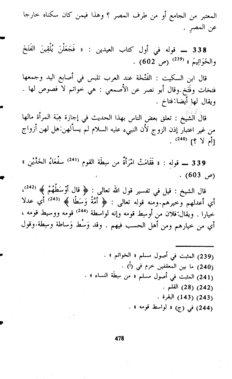 338 - قوله في أول كتاب العيدين: "فَجَعَلْنَ يُلْقِينَ الفَتَخَ والخَوَاتِيمَ" (¬239) (ص 602).