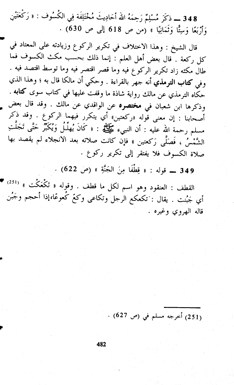 348 - ذكَرَ مُسْلِمٌ رَحِمَهُ الله أحَادِيثَ مُخْتَلِفَة فِي الكُسُوف: "رَكْعَتَيْنِ وَأرْبَعًا وَسِتًّا وَثَمَانِيًا" (من ص 618 إلى ص 630).