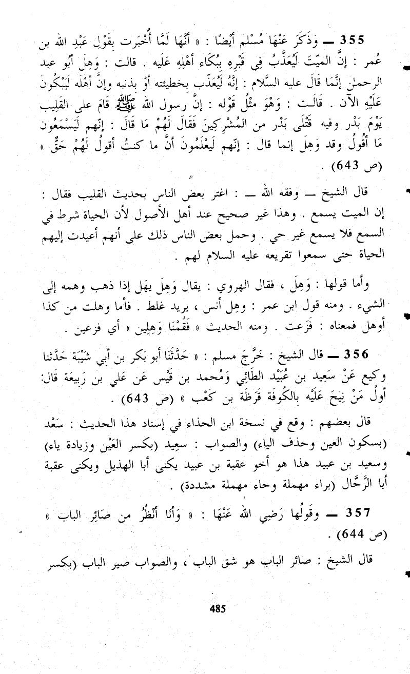 355 - وذَكَرَ عَنْهَا مُسْلم أيْضًا: "أنَّهَا لَمَّا أُخبَرت بِقَولِ عَبْدِ الله بن عُمر: إنَّ الميّتَ لَيُعَذَّبُ فِي قَبْرِهِ بِبُكَاء أهْلِهِ عَلَيه. قالت: وَهِلَ أبُو عبد الرحمن إنَّمَا قَالَ عليه السَّلام: إنَّهُ لَيُعَذّب بِخطيئته أوْ بِذنبه وإنَّ أهْلَه لَيَبْكُونَ عَلَيْهِ الآن. قَالَت: وَهْوَ مثْلُ قَوْله: إنَّ رسول الله - صلى الله عليه وسلم - قَامَ على القَلِيب يَوْمَ بَدْر وفيه قَتْلَى بَدْر من المُشْرِكِينَ فَقَالَ لَهُمْ مَا قَالَ: إنّهم لَيَسْمَعُون مَا أقُولُ وقد وَهِلَ إنما قال: إنّهم لَيعْلَمُونَ أنَّ ما كنتُ أقولُ لَهُمْ حَقٌّ" (ص 643).