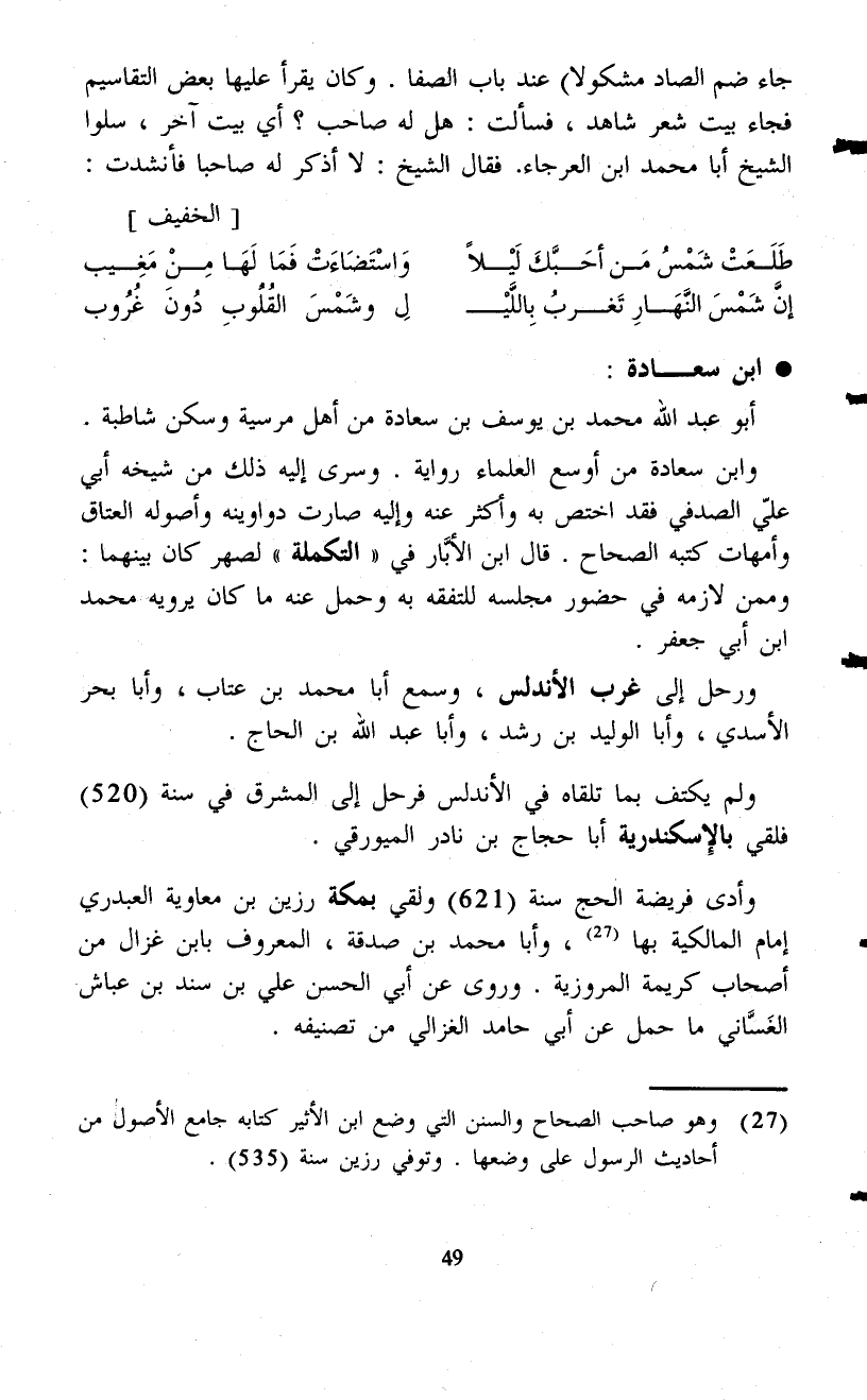 جاء ضم الصاد مشكولاً) عند باب الصفا. وكان يقرأ عليها بعض التقاسيم فجاء بيت شعر شاهد، فسألت: هل له صاحب؟ أي بيت آخر، سلوا الشيخ أبا محمد ابن العرجاء. فقال الشيخ: لا أذكر له صاحبا فأنشدت: