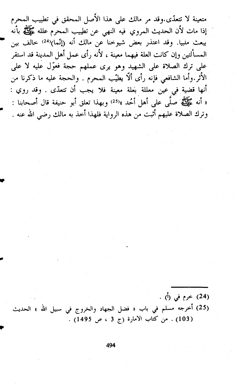 متعينة لا تتعدّى. وقد مر مالك على هذا الأصل المحقق في تطييب المحرم إذا مات لأن الحديث المروي فيه النهي عن تطييب المحرم علله - صلى الله عليه وسلم - بأنه يبعث ملبياً. وقد اعتذر بعض شيوخنا عن مالك أنه (إنّما) (¬24) خالف بين المسألتين وإن كانت العلة فيهما معينة، لأنه رأى عمل أهل المدينة قد استقر على ترك الصلاة على الشهيد وهو يرى عملهم حجة فعوّل عَليه لا على الأثر. وأما الشافعي فإنه رأى ألا يطيّب المحرم. والحجة عليه ما ذكرنا من أنها قضية في عين معللة بعلة معينة فلا يجب أن تتعدّى. وقد روي: "أنه - صلى الله عليه وسلم - صلَّى على أهل أحُد" (¬25) وبهذا تعلق أبو حنيفة قال أصحابنا: وترك الصلاة عليهم أثبت من هذه الرواية فلهذا أخذ به مالك رضي الله عنه.