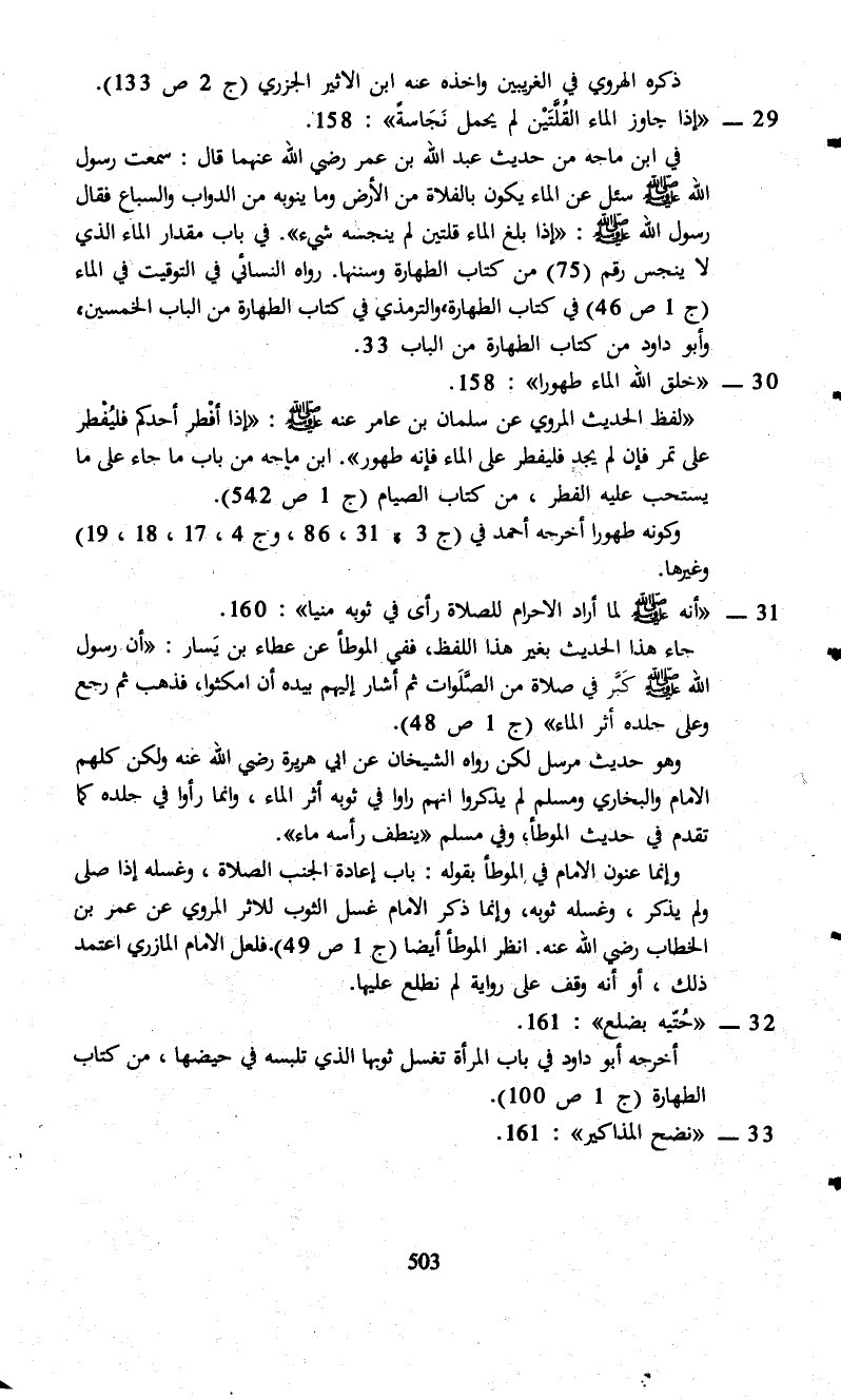 29 - "إذا جاوز الماء القُلَّتَيْن لم يحمل نَجَاسةً": 158.