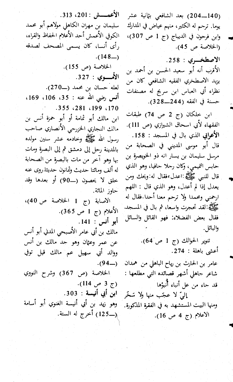 ابن خلكان (ج 2 ص 74) طبقات الفقهاء لأبي اسحاق الشيرازي (ص 111). الأعرابي الذي بال في المسجد: 158. قال أبو موسى المديني في الصحابة من مرسل سليمان بن يسار أنه ذو الخويصرة بن حابس التميمي، وكان رجلاً جافياً، وهو الذي قال للنبى - صلى الله عليه وسلم -: اعدل، فقال له: ويحك ومن يعدل إذا لم أعدل، وهو الذي قال: اللهم ارحمني ومحمداً ولا ترحم معنا أحداً. فقال له - صلى الله عليه وسلم -: لقد تحجرت واسعاً، ثم بال في المسجد فقال بعض الفضلاء: فهو القائل والسائل والبائل.