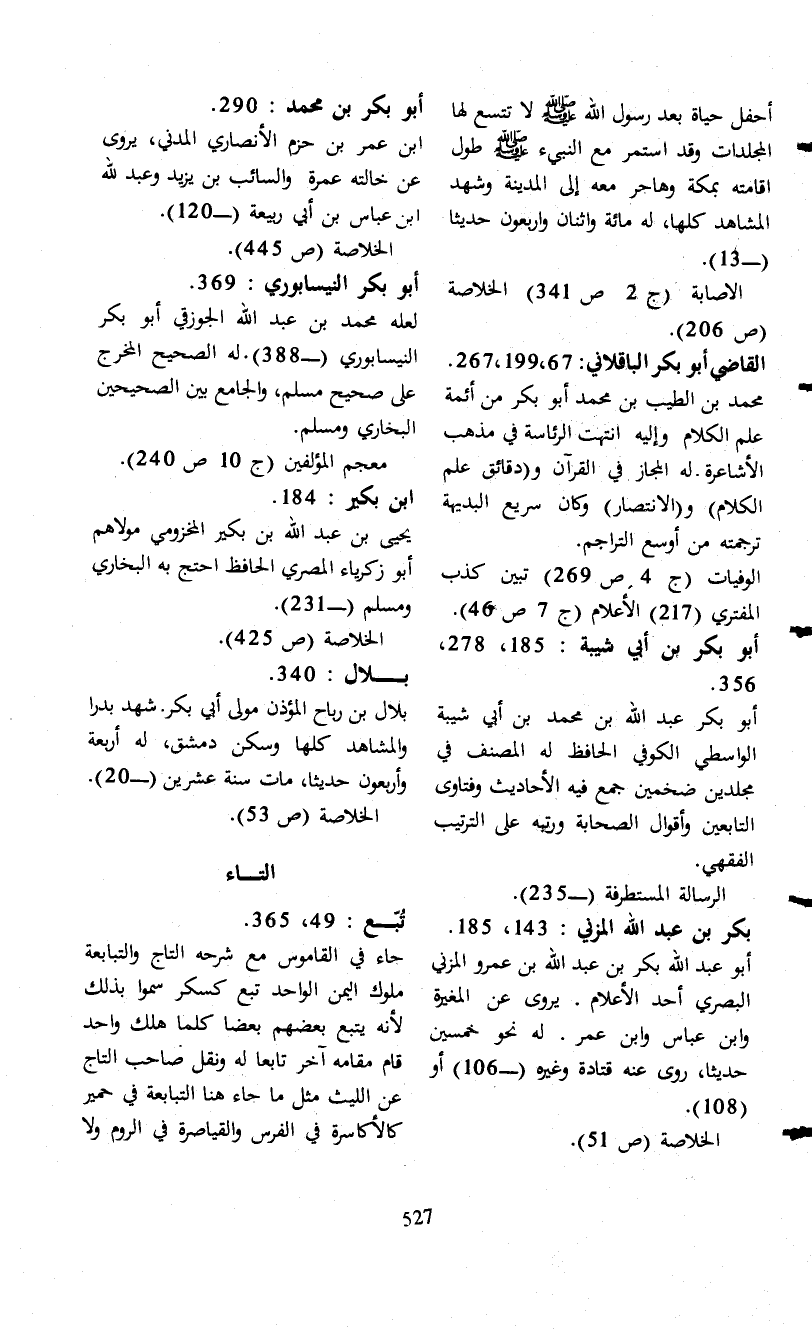 بكر بن عبد الله المزني: 143، 185. أبو عبد الله بكر بن عبد الله بن عمرو المزني البصري أحد الأعلام. يروى عن المغيرة وابن عباس وابن عمر. له نحو خمسين حديثاً، روى عنه قتادة وغيره (- 106) أو (108).