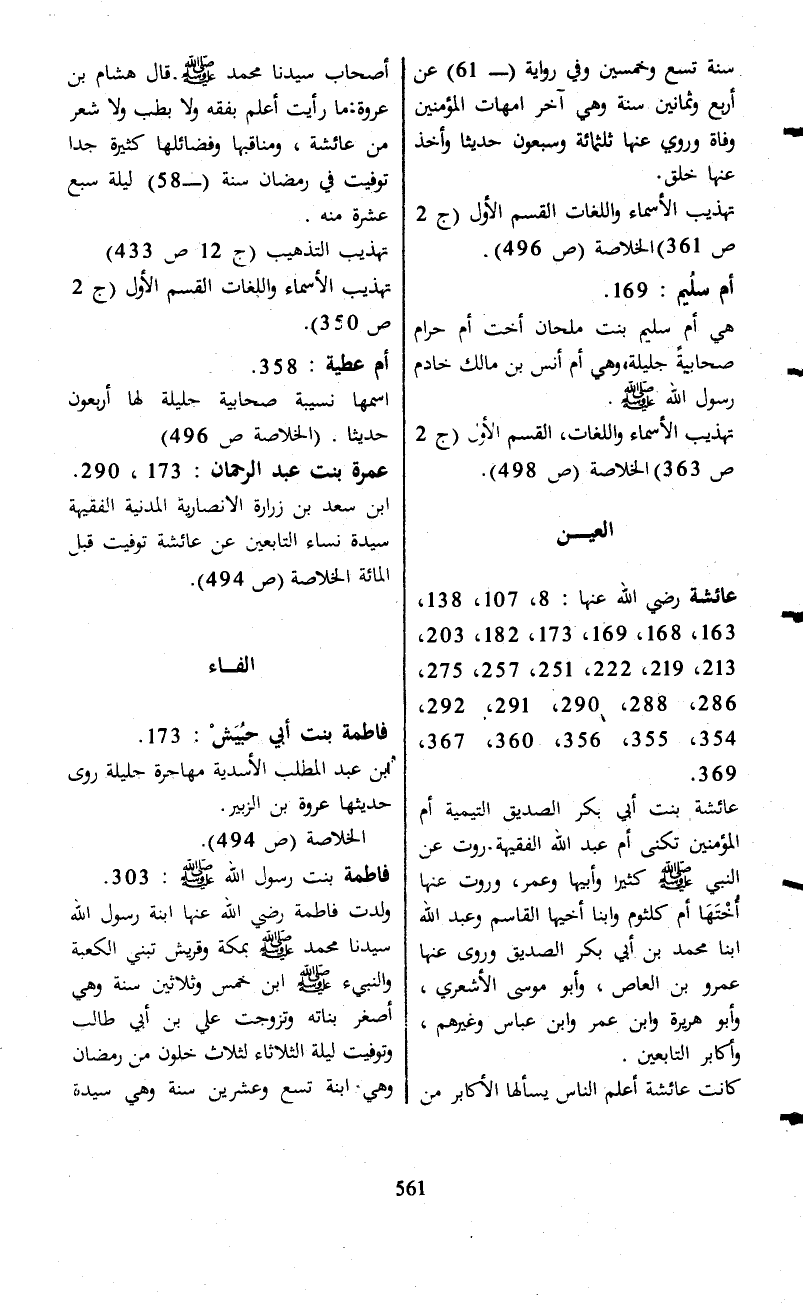 عائشة رضي الله عنها: 8، 107، 138، 163، 168، 169، 173، 182، 203، 213، 219، 222، 251، 257، 275، 286، 288، 290، 291. 292، 354، 355، 356، 360، 367، 369.