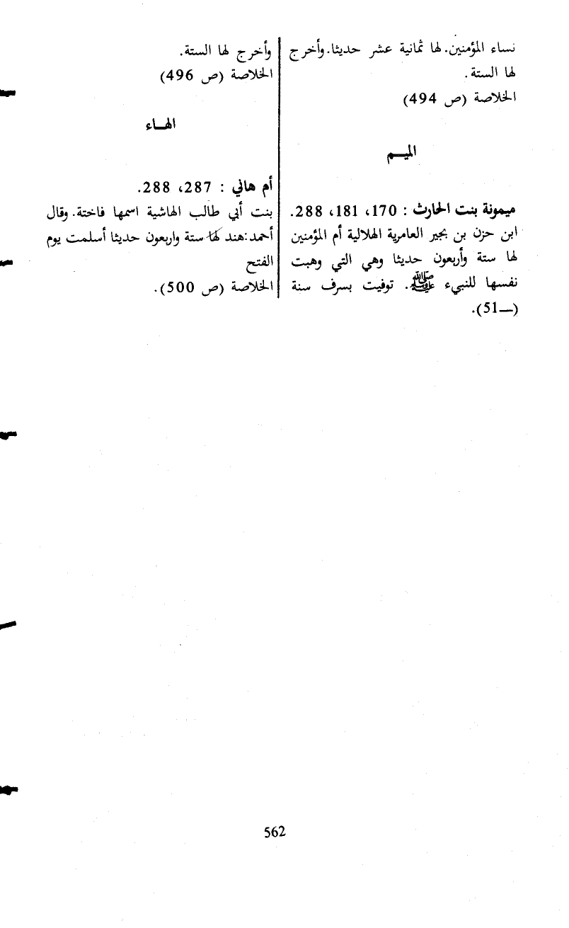 ابن حزن بن بجير العامرية الهلالية أم المؤمنين لها ستة وأربعون حديثاً وهي التي وهبت نفسها للنبىء - صلى الله عليه وسلم -. توفيت بسرف سنة (- 51) وأخرج لها الستة.