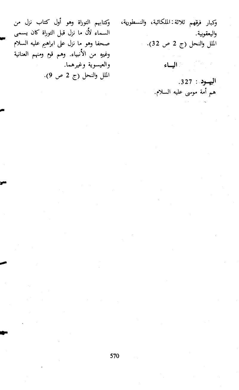 وكتابهم التوراة وهو أول كتاب نزل من السماء لأن ما نزل قبل التوراة كان يسمى صحفاً وهو ما نزل على إبراهيم عليه السلام وغيره من الأنبياء. وهم قوم ومنهم العنانية والعيسوية وغيرهما.