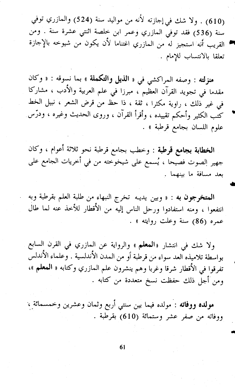 (610). ولا شك في إجازته لأنه من مواليد سنة (524) والمازري توفي سنة (536) فقد توفي المازري وعمر ابن خلصة اثنتي عشرة سنة. ومن القريب أنه استجيز له من المازري اغتناما لأن يكون من شيوخه بالإِجازة تعلقاً بالانتساب للإِمام.