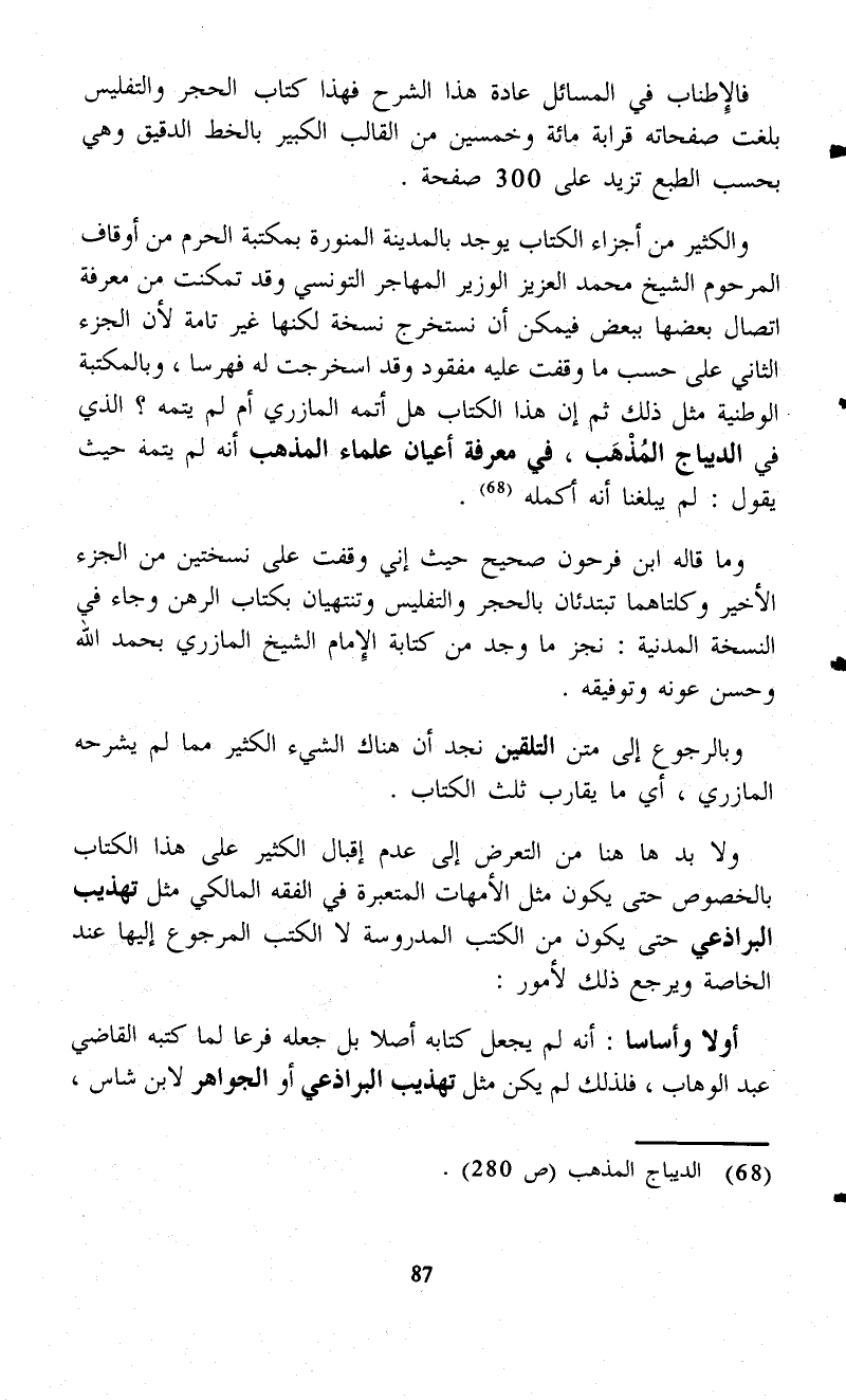 وما قاله ابن فرحون صحيح حيث إني وقفت على نسختين من الجزء الأخير وكلتاهما تبتدئان بالحجر والتفليس وتنتهيان بكتاب الرهن وجاء في النسخة المدنية: نجز ما وجد من كتابة الإِمام الشيخ المازري بحمد الله وحسن عونه وتوفيقه.