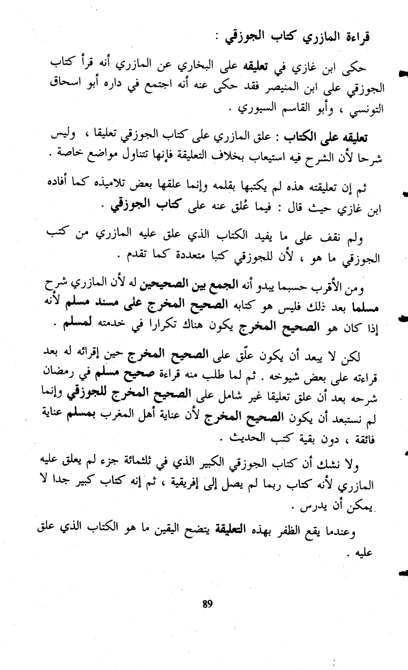 ولا نشك أن كتاب الجوزقي الكبير الذي في ثلثمائة جزء لم يعلق عليه المازري لأنه كتاب ربما لم يصل إلى إِفريقية، ثم إنه كتاب كبير جداً لا يمكن أن يدرس.