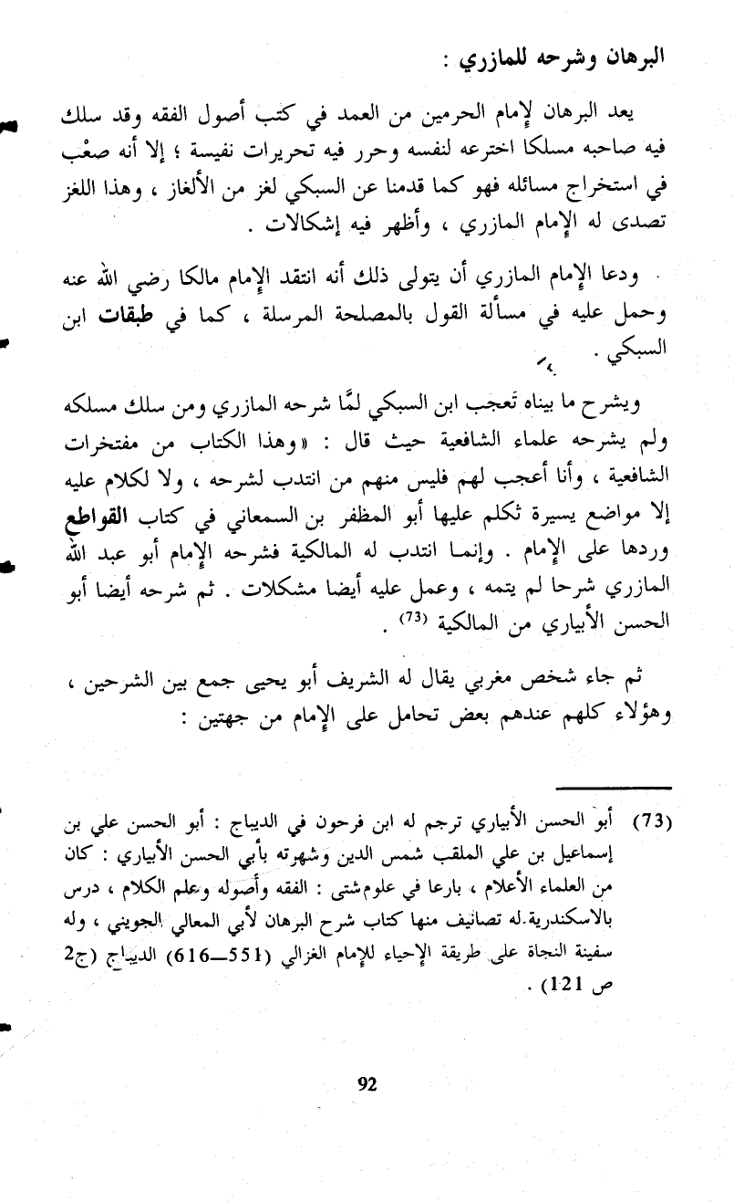 (¬73) أبو الحسن الأبياري ترجم له ابن فرحون في الديباج: أبو الحسن على بن إسماعيل بن علي الملقب شمس الدين وشهرته بأبي الحسن الأبياري: كان من العلماء الأعلام، بارعاً في علوم شتى: الفقه وأصوله وعلم الكلام، درس بالإِسكندرية. له تصانيف منها كتاب شرح البرهان لأبي المعالي الجويني، وله سفينة النجاة على طريقة الإِحياء للإِمام الغزالي (551 - 616) الديباج (ج2 ص 121).