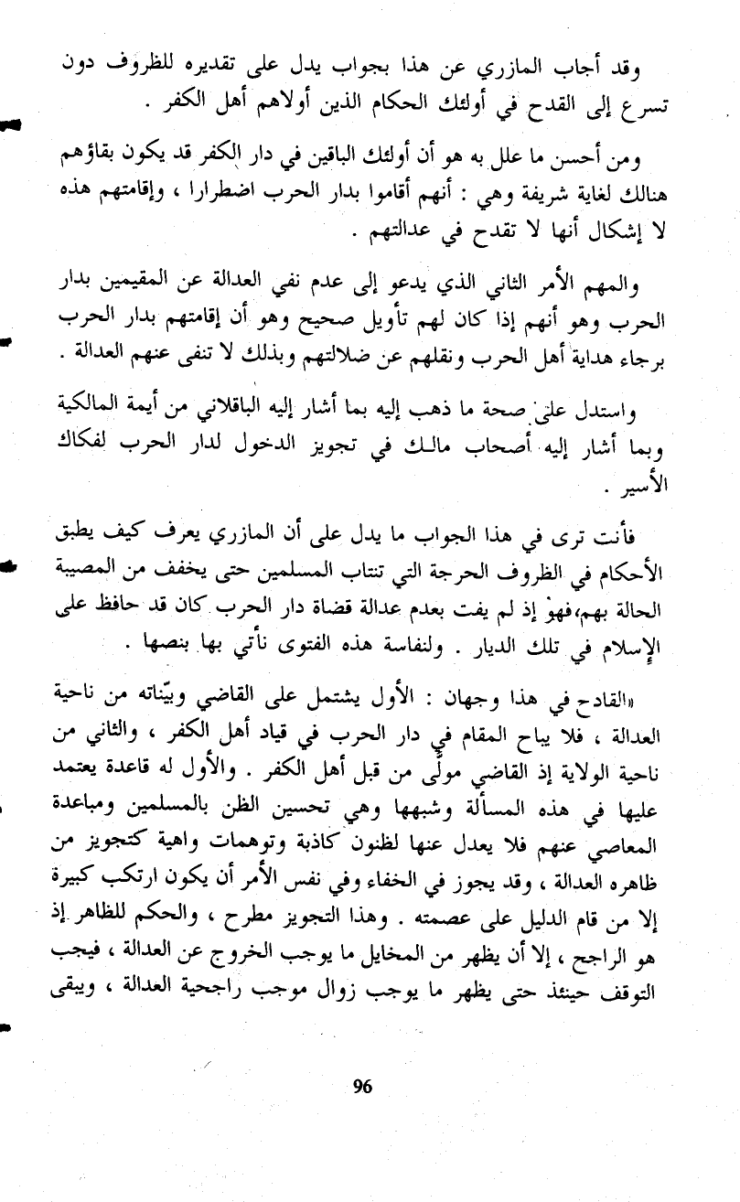 فأنت ترى في هذا الجواب ما يدل على أن المازري يعرف كيف يطبق الأحكام في الظروف الحرجة التي تنتاب المسلمين حتى يخفف من المصيبة الحالة بهم، فهو إذ لما يفت بعدم عدالة قضاة دار الحرب كان قد حافظ على الإِسلام في تلك الديار. ولنفاسة هذه الفتوى نأتي بها بنصها.