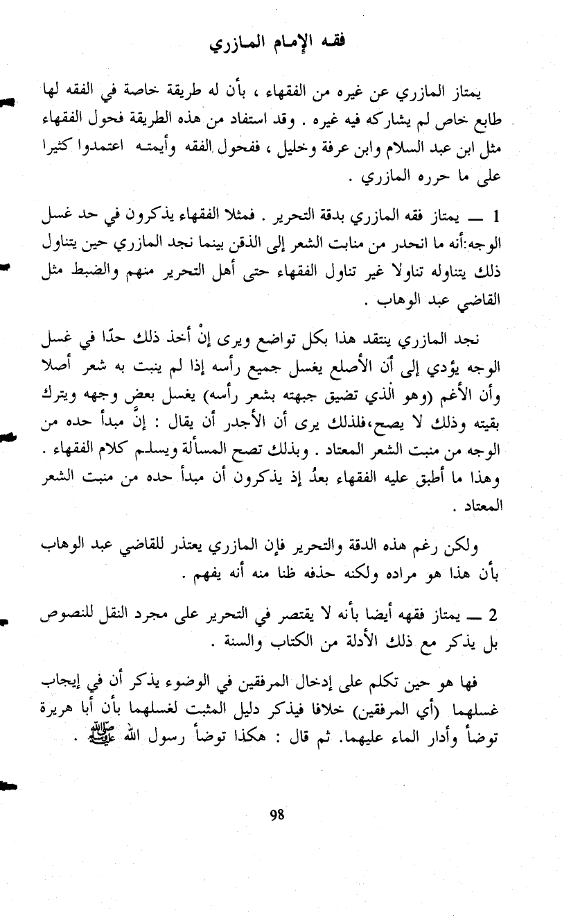 1 - يمتاز فقه المازري بدقة التحرير. فمثلا الفقهاء يذكرون في حد غسل الوجه: أنه ما انحدر من منابت الشعر إلى الذقن بينما نجد المازري حين يتناول ذلك يتناوله تناولاً غير تناول الفقهاء حتى أهل التحرير منهم والضبط مثل القاضى عبد الوهاب.