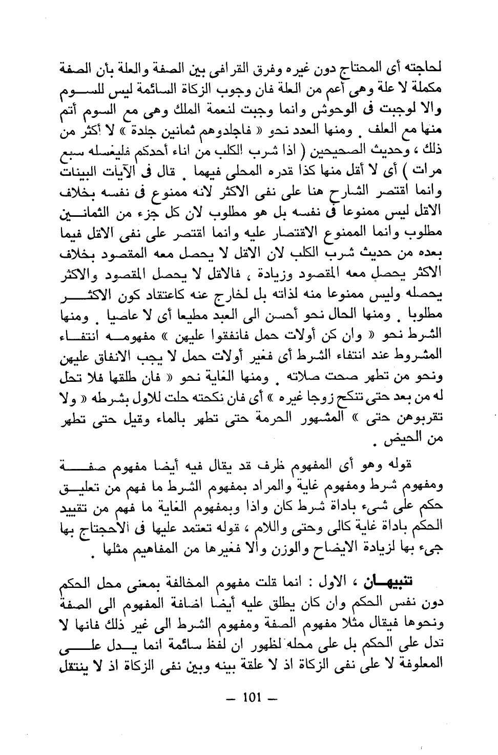 لحاجته أي المحتاج دون غيره وفرق القرافي بين الصفة والعلة بأن الصفة مكملة لا علة وهي أعم من العلة فإن وجوب الزكاة السائمة ليس للسوم وإلا لوجبت في الوحوش وإنما وجبت لنعمة الملك وهي مع السوم أتم منها مع العلف. ومنها العدد نحو ((فاجلدوهم ثمانين جلدة)) لا أكثر من ذلك، وحديث الصحيحين (إذا شرب الكلب من إناء أحدكم فليغسله سبع مرات) أي لا أقل منها كذا قدره المحلي فيهما. قال في الآيات البينات وإنما اقتصر الشارح هنا على نفي الأكثر لأنه ممنوع في نفسه بخلاف الأقل ليس ممنوعًا في نفسه بل هو مطلوب لأن كل جزء من الثمانين مطلوب وإنما الممنوع الاقتصار عليه وإنما اقتصر على نفي الأقل فيما بعده من حديث شرب الكلب لأن الأقل لا يحصل معه المقصود بخلاف الأكثر يحصل معه المقصود وزيادة، فالأقل لا يحصل المقصود والأكثر يحصله وليس ممنوعًا منه لذاته بل لخارج عنه كاعتقاد كون الأكثر مطلوبًا. ومنها الحال نحو أحسن إلى العبد مطيعًا أي لا عاصيًا. ومنها الشرط نحو ((وإن كن أولات حمل فانقوا عليهن)) مفهومه انتفاء المشروط عند انتفاء الشرط أي فغير أولات حمل لا يجب الإنفاق عليهن ونحو من تطهر صحت صلاته. ومنها الغاية نحو ((فإن طلقها فلا تحل له من بعد حتى تنكح زوجًا غيره)) أي فإن نكحته حلت للأول بشرطه ((ولا تقربوهن حتى)) المشهور الحرمة حتى تطهر بالماء وقيل حتى تطهر من الحيض.