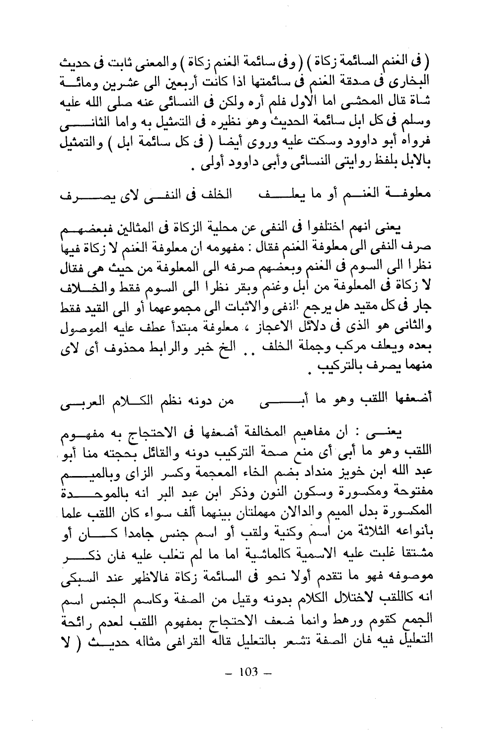 يعني أنهم اختلفوا في النفي عن محلية الزكاة في المثالين فبعضهم صرف النفي إلى معلوفة الغنم فقال: مفهومه أن معلوفة الغنم لا زكاة فيها نظرًا إلى السوم في الغنم وبعضهم صرفه إلى المعلوفة من حيث هي فقال لا زكاة في المعلوفة من إبل وغنم وبقر نظرًا إلى السوم فقط والخلاف جار في كل مقيد هل يرجع النفي والإثبات إلى مجموعهما أو إلى القيد فقط والثاني هو الذي في دلائل الإعجاز، معلوفة مبتدأ عطف عليه الموصول بعده ويعلف مركب وجملة الخلف .. الخ خبر والرابط محذوف أي لأي منهما يصرف بالتركيب.
